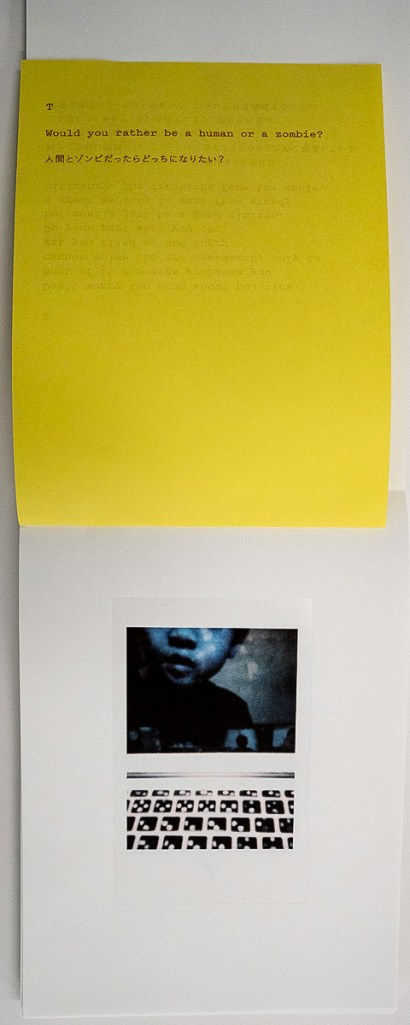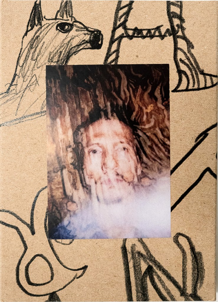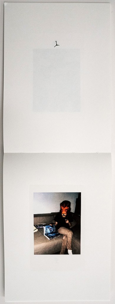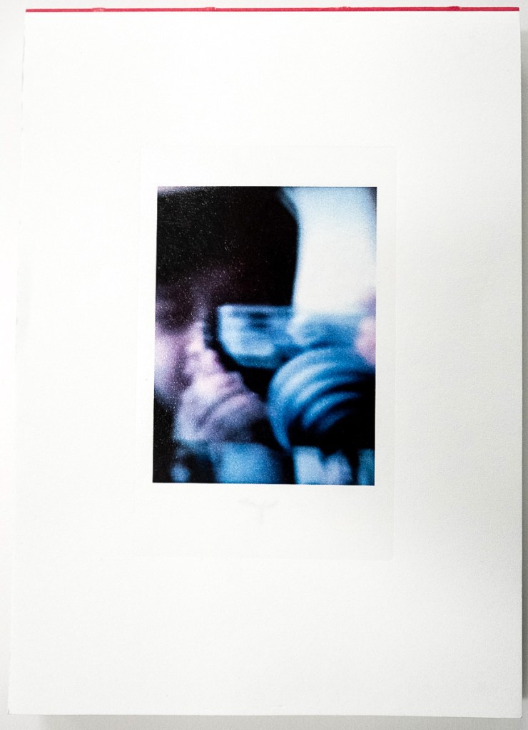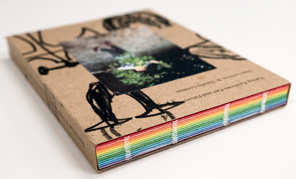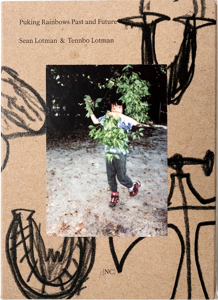 Puking Rainbows, Past and Future is a captivating collaborative project by Sean Lotman and his son Tennbo, blending the boundaries between photobook and artist book. Encased in a cardboard slipcover adorned with Sharpie doodles and Instax prints—featuring individual portraits of the duo on the front and back—each copy is a unique edition, emphasizing its artistic essence. Measuring 4.25” x 6” with pages glued and stitched at the top, the book’s design playfully evokes the feel of a flipbook. While my reviews typically don’t delve deeply into design details, this project’s innovative and personal approach demands the extra attention to fully appreciate its creative vision.
