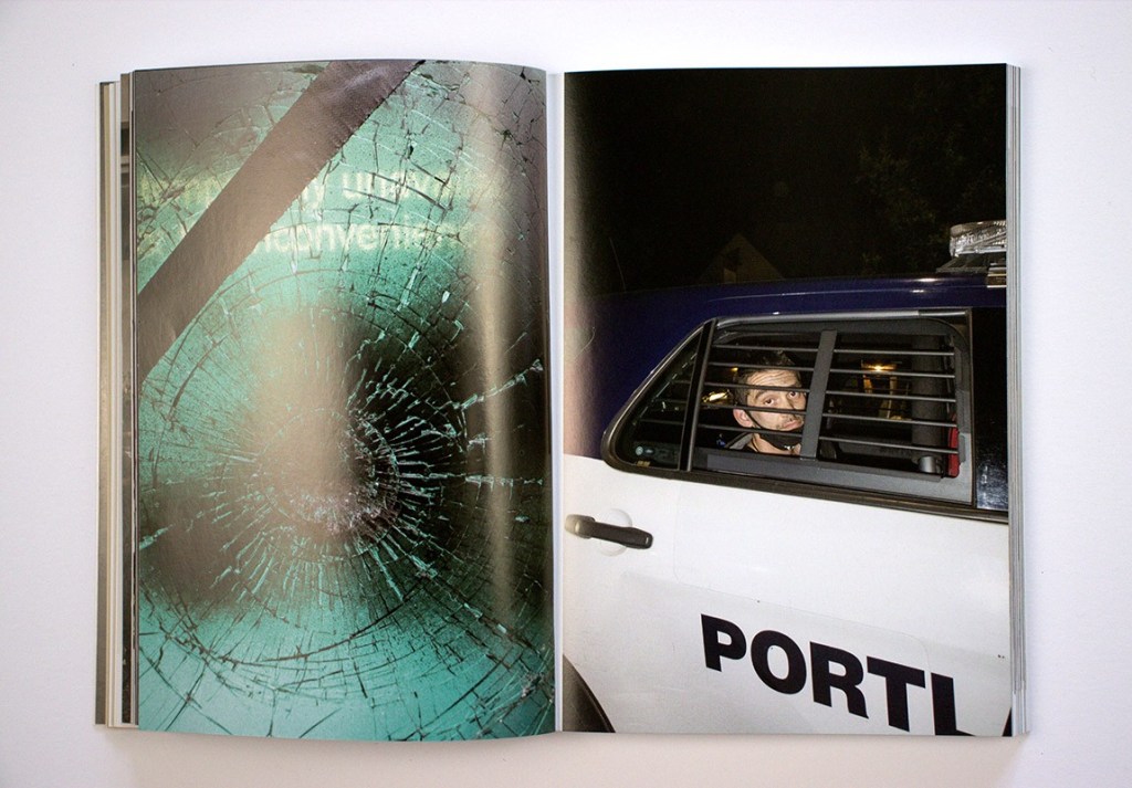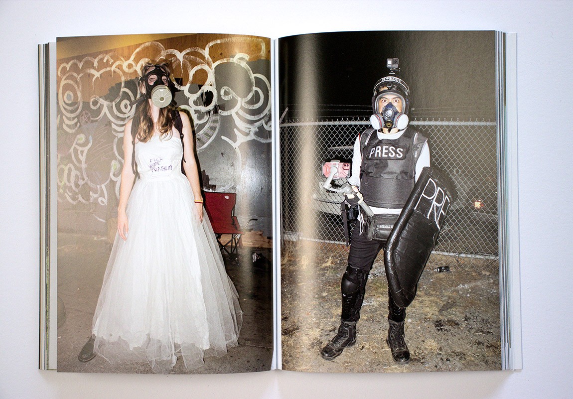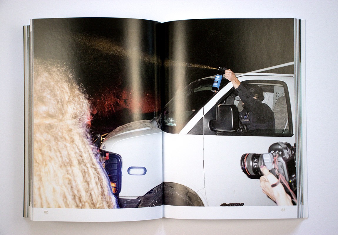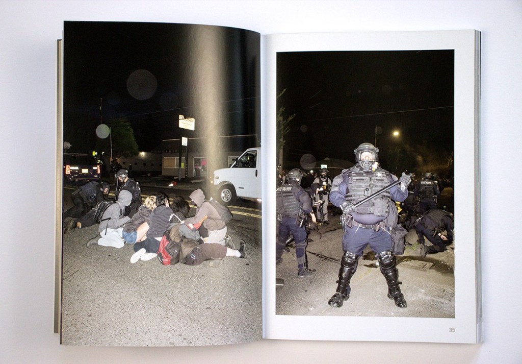 Dundon doesn’t obviously take sides in the book but shows events without editorializing. Given that he was on the side of the street with the protesters and not with the police or the Proud Boys, however, you can intuit where his sympathies likely lie. He shows admirable restraint in this regard, as on one occasion he paid a price for being too close, thrown and pinned to the ground by a federal marshal even though he was clearly identified as press.
