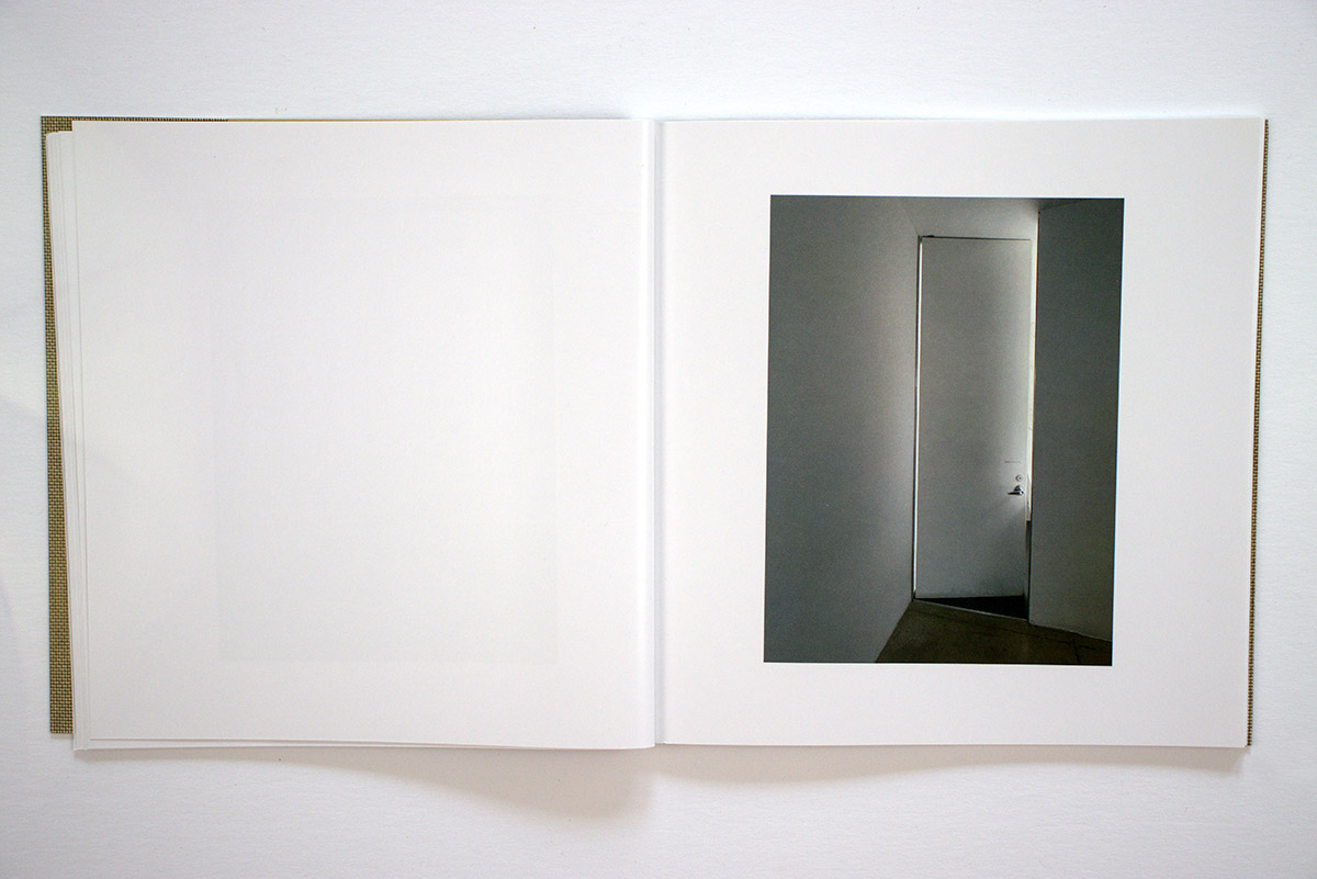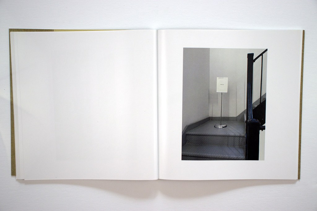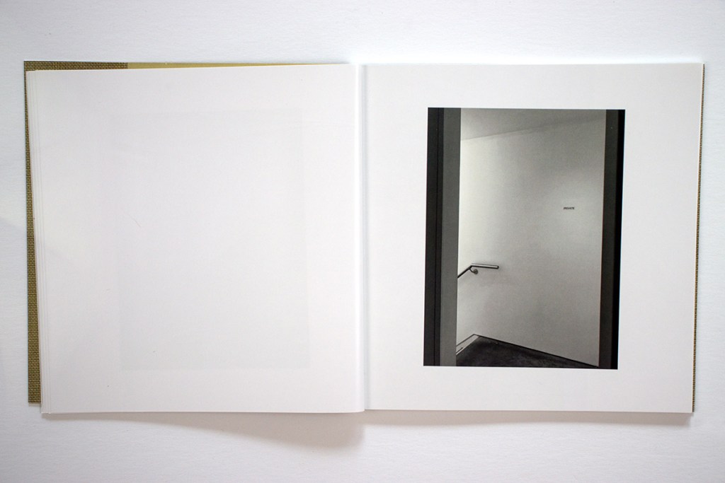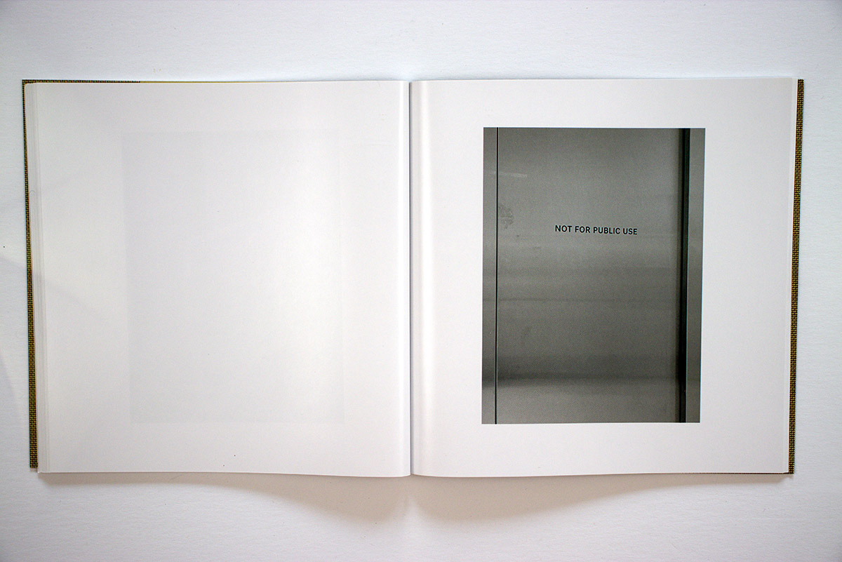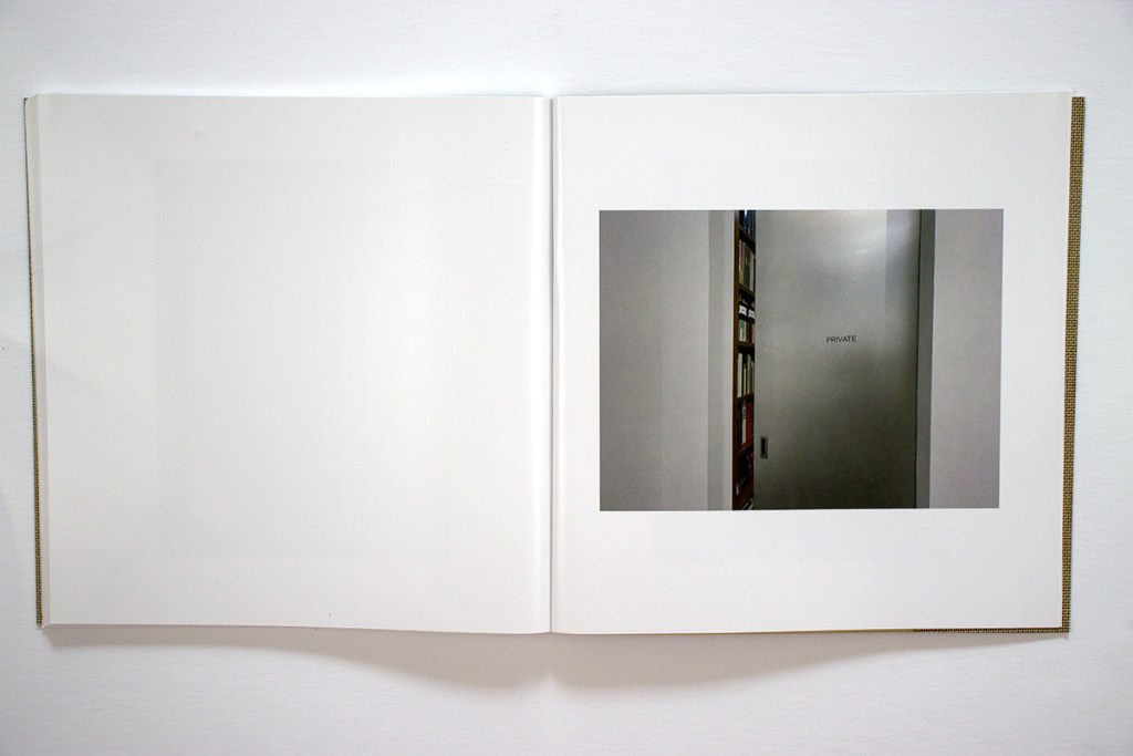 The book is set up as a sequence of photos, one to a page spread, that are variations on a theme, where the theme is views of off-limits interior private areas seen from the other side of closed doors – but you do not actually see much of the out-of-bounds areas. The variations are the small but significant details: door or no door, slightly open or closed, wood or glass; chain or rope barrier or none; stairs, elevator, or hall; glimpse of beyond or not; the kind of door handle – knob or handle or crash bar; sign or no sign; the variety of sign typefaces; the sign location (door, wall, stand); the sign wording; the flooring; the wall color; the pictorial space including the lines, planes, angles, and patterns made by door, wall, floor, lighting, and shadows; plus the format of the photographs themselves – mostly the same but with a number of outliers, just enough to surprise you.