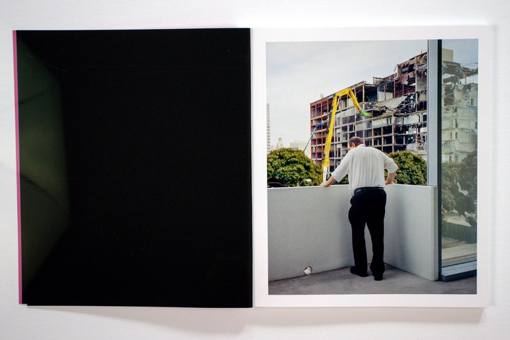 Several of the pictures make me think of the work of other contemporary photographers. The first photo of the man juxtaposed against a building being demolished for me echoes Joel Sternfeld’s fireman buying a pumpkin while a house burns nearby. Bruce Davidson might have taken a photo of a woman holding her two dogs. Diane Arbus could have made the photo of the man with slicked-back hair, but she would have made him look weird rather than dignified. I could go on, but my point is that Callahan has absorbed the broad influence of American straight documentary photography and seems comfortable continuing the tradition in Exhaust.