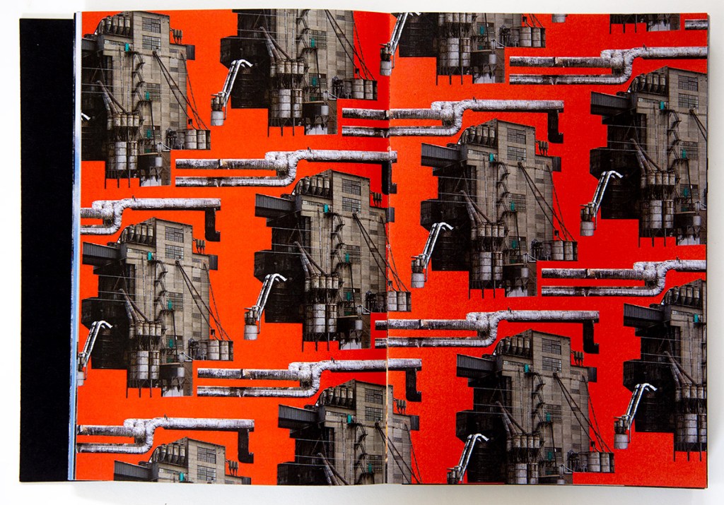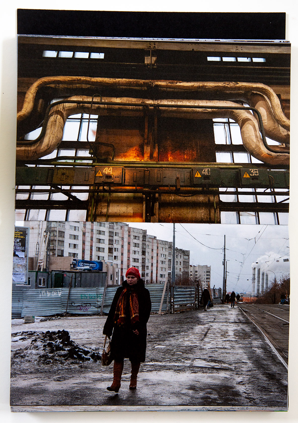 A printed signature can allow a double gate-fold created by the two center sheets, thus the book’s nine signatures allow the inclusion of nine double gatefolds that alters the pace, sequential flow and reading of this artist book. Present within the gate-folds are the unseen Russian workers who inhabit these industrial complexes, providing another layer of social complexity. Gignoux provides working portraits of individuals who are involved in dangerous working conditions as a trade-off to obtain a living income.