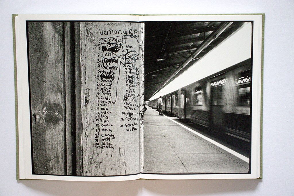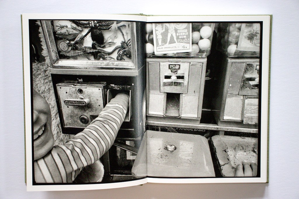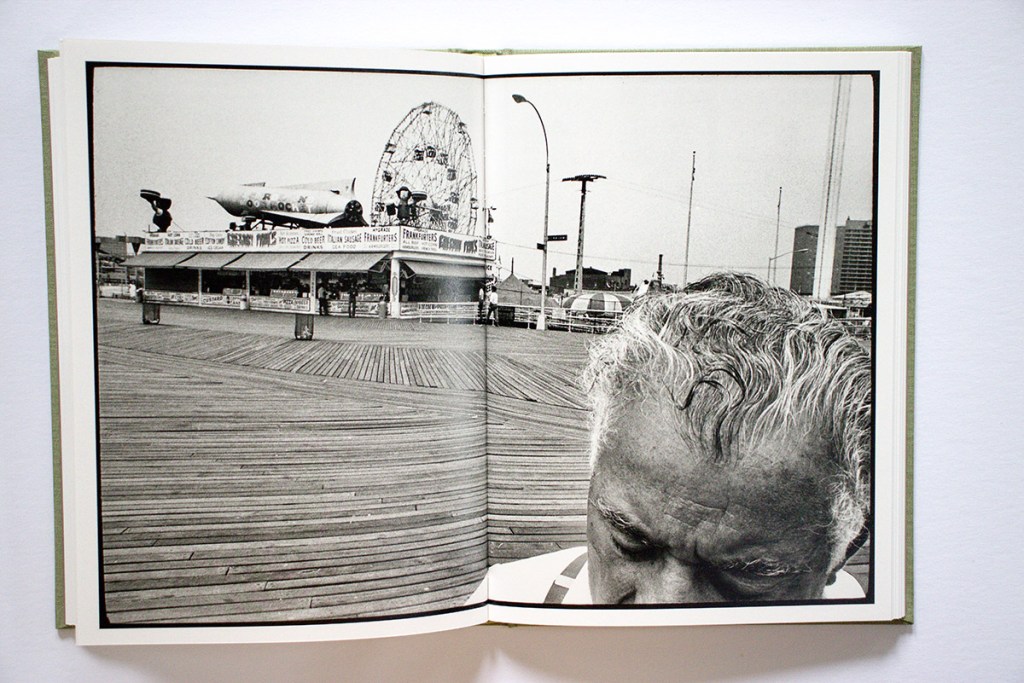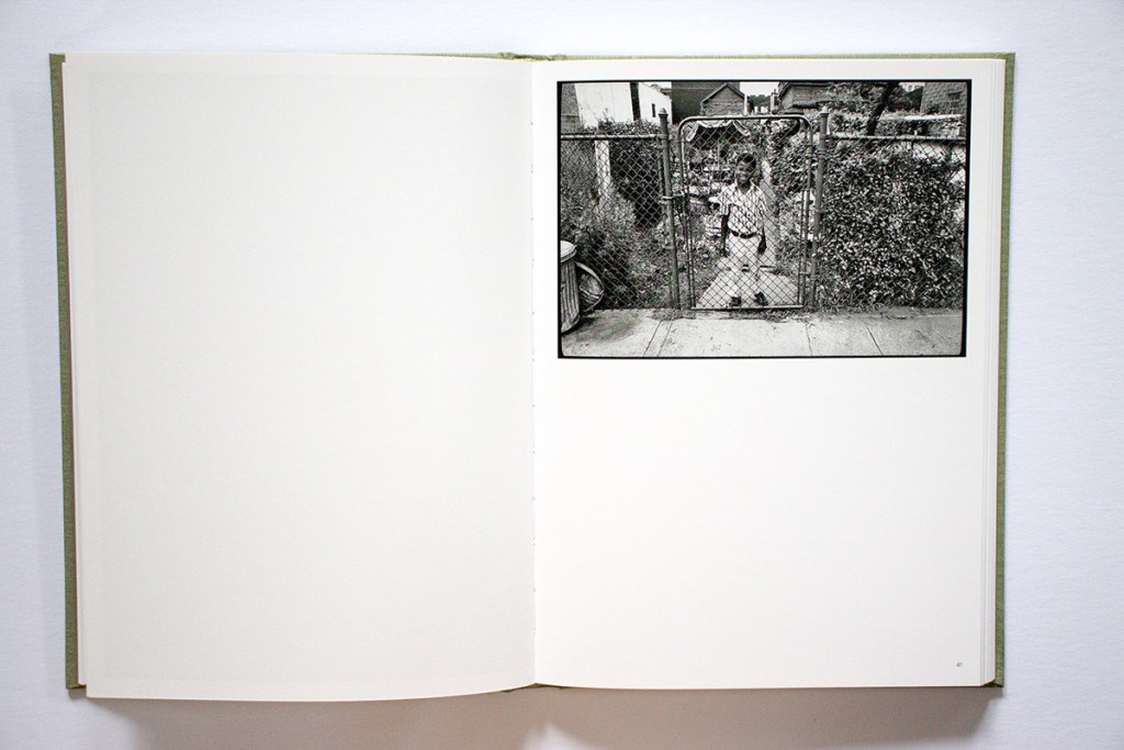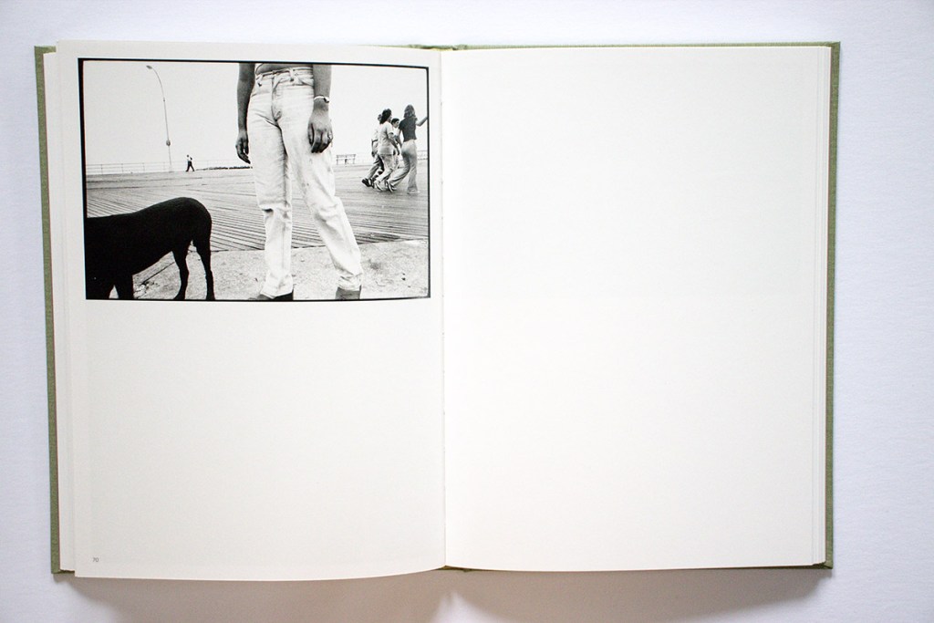 The image that gives its name to the book, “Tall socks,” also hits a sweet spot. It is definitely a memorable picture, but why? Is it the low viewpoint, the chain-link fence, the simple yet pleasing variety of objects, shapes, textures, and tones? Or is it how Cohen’s white socks function like poet William Carlos Williams’ white chickens? Whatever it is, it works. Layering on some additional visual dynamics, on the opposite page we see a white dog on a leash.