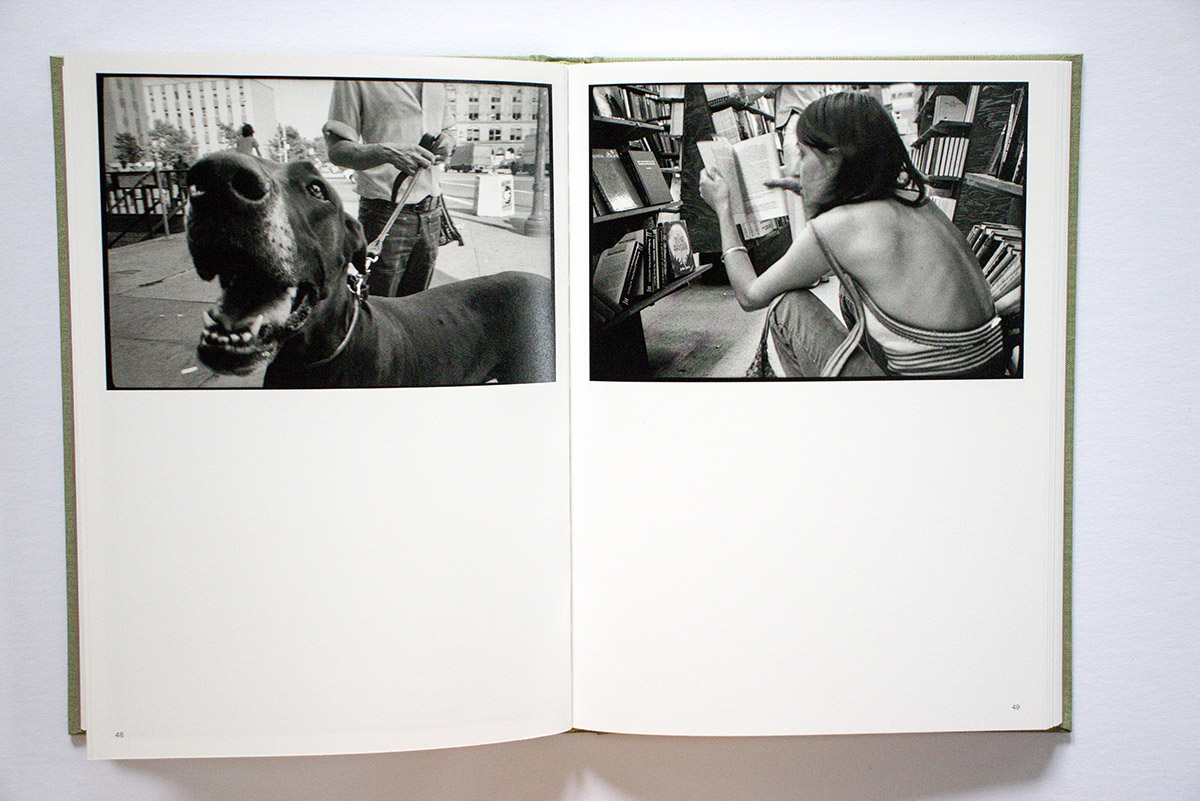 The image that gives its name to the book, “Tall socks,” also hits a sweet spot. It is definitely a memorable picture, but why? Is it the low viewpoint, the chain-link fence, the simple yet pleasing variety of objects, shapes, textures, and tones? Or is it how Cohen’s white socks function like poet William Carlos Williams’ white chickens? Whatever it is, it works. Layering on some additional visual dynamics, on the opposite page we see a white dog on a leash.