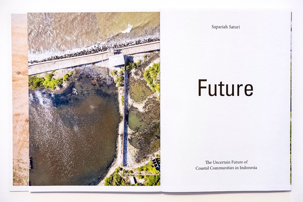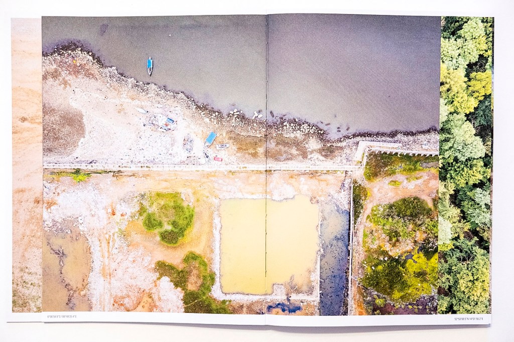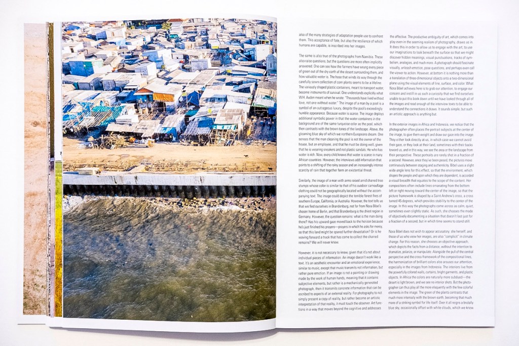 The book is also wide-ranging in terms of geography. It proceeds as an exploration of Indonesia, Namibia, and Germany. In this way, the book relies on the logic of many, especially European research projects that utilize a multi-part case study approach. There is also an element of a cultural survey approach happening here (indeed, Christiane Stahl mentions how the interviews in the book depict “universal” qualities), common to photographic projects of this type, although the reasons for choosing these three “sites” remains a bit opaque. Connections are not really made between the cases beyond the idea that through surveying different nation-states in the world-system, we, the readers, learn about the multifaceted impacts of climate change. This assumes a bit of methodological knowledge on the apt of the reader. For instance, we might imagine that the logic is loosely comparative. Presumably, an underlying idea here is that Germany was chosen as it was a high income, high GDP country, with Indonesia falling more in the middle of these variables, and Namibia the lower end of the spectrum. The colonial connection between Namibia and Germany is not unpacked, although the texts across the book help to loosely illuminate some basic contours of how global inequalities and the unequal exchanges of resources are implied in climate change. And, within the broader remit of climate change, water is a unifying theme. This variously includes the issue of access to water, but also flooding, and the control of water in the form of canals, pools, rivers etc. Throughout, the organization tends towards scene-setting images, often overhead views from drones, that then give way to more intimate environmental portraits. Many of the drone landscape images are further indicated with GPS coordinates neatly tucked into the corner of the page, further evidencing the care and attention to documentary detail that Bibel deploys.