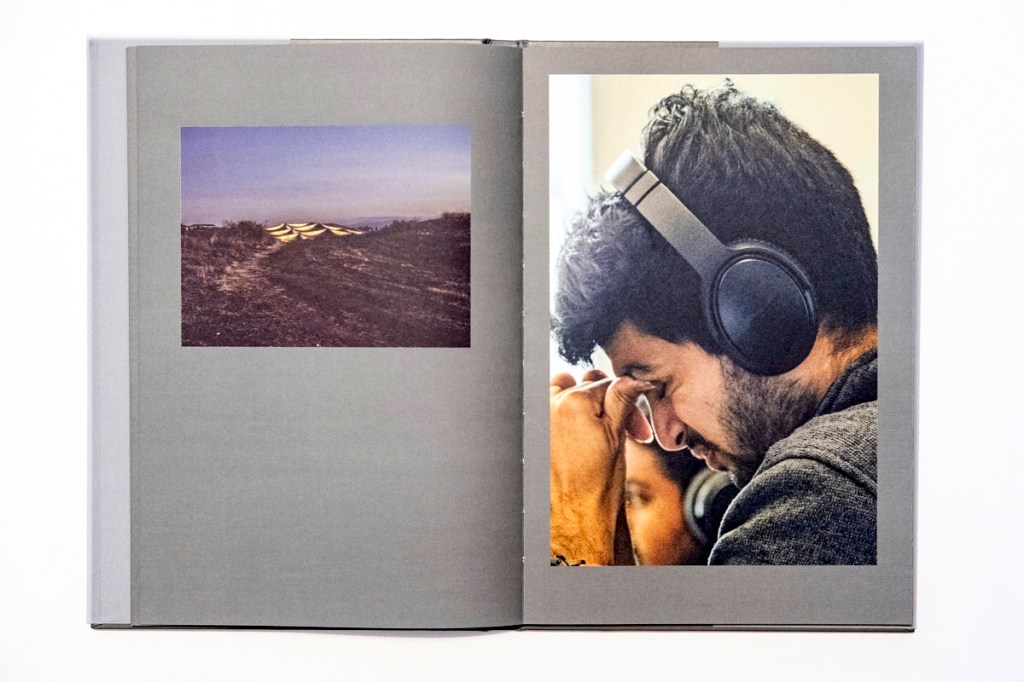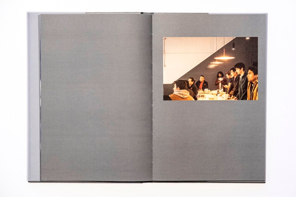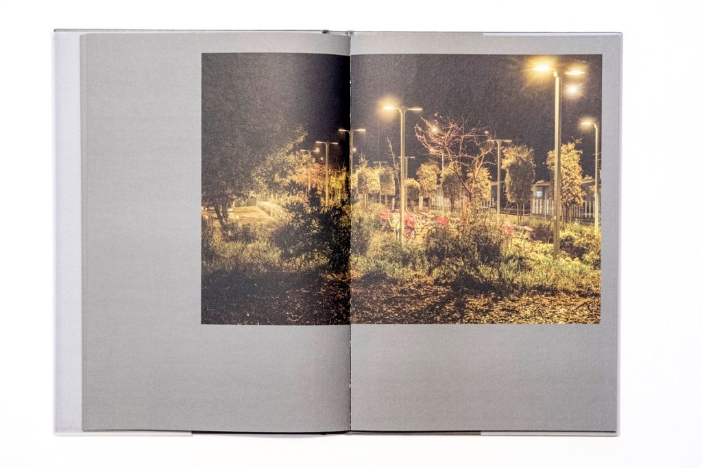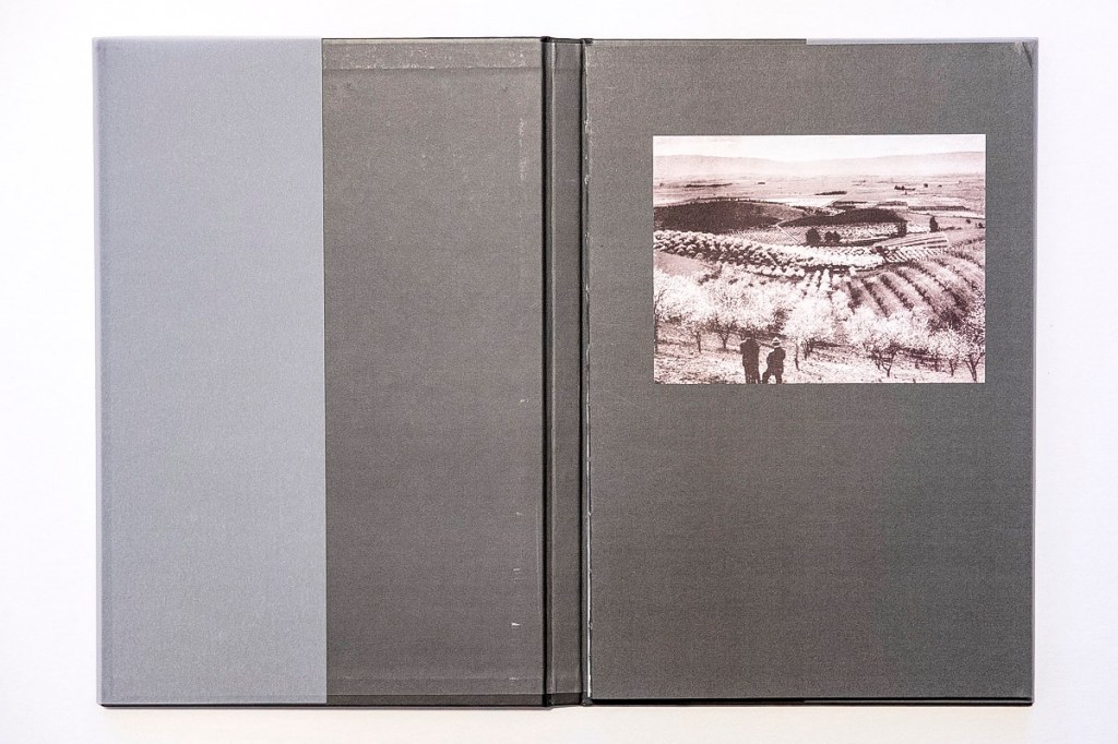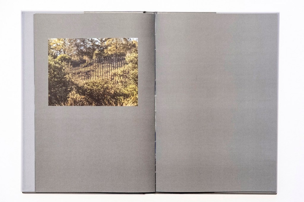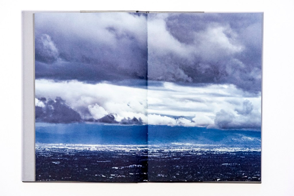 Invited into the book in this unique way, the viewer then encounters 39 images, one of which is an historical image of the Santa Clara Valley, which is described as: “orchards abloom in springtime near San Jose – photographer unknown.” The rest of the images are in color, set against grey pages, sewn together with an exposed binding enveloped in thick cardboard covers. Indeed, it is with the first image – of two men in hats at the bottom of the frame looking out, seemingly surveying, or content, with the verdant valley below – that the viewer begins to understand Voss’ idea even better, this notion of “haunting” that he implies and that becomes clearer throughout the book. This book is about a place that has been and continues to be a palimpsest of, if not “binary,” then dialectical oppositions, of human labor and industrial capacities. Voss hints at this in his text that concludes the book as well. The book’s title comes from Malcolm Harris’ Palo Alto: A History of California Capitalism and the World: “Palo Alto is haunted,” writes Harris.