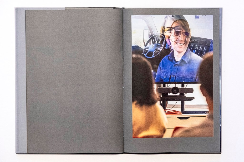 Furthermore, Voss’ choice to focus on the banal and mundane is an important feature of this work. People are often at work, and on their way to work. Work seems to follow everyone everywhere here in a seemingly “normal” place, an unsuspecting place. It is a place of green trees and sun and rain. In this way it is a project about “everyday” – about the phenomenal experience of Silicon Valley. It is not about tech gadget releases and spectacle, but rather, throughout the project Voss points to making the quotidian strange through his use of light and composition, never discriminating on the types of subject matter that can help illustrate this story (barricades and closed gate structures are worked in throughout as well, articulating the atmosphere of surveillance and enclosure – ubiquitous features of bourgeois cultural geography the world over). For example, in one of the more notable “passages,” if I can call it that, of the book, we see a double page spread of a large monitor in an anonymous office building that reads “Tap Controller to Start,” which is followed by an abandoned house. The shiny new surface of things covers over the history of place. Then these ideas coalesce in the following image – a telephoto view (or close crop) of a conference room with onlookers regarding a screen. Simultaneously, a Logitech® camera eye is looking back, and two people, not one, are on the television, caught by Voss’ camera in an overlaid moment: two smiling faces, one over the other. This is but one example of how Voss expertly places the work of performance at the level of everyday existence in Silicon Valley into question time and again. The smiling faces on-screen contrast with that of the more candid portraits of pressure, anxiety, and boredom.