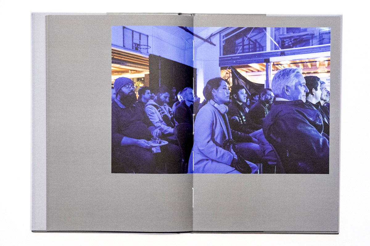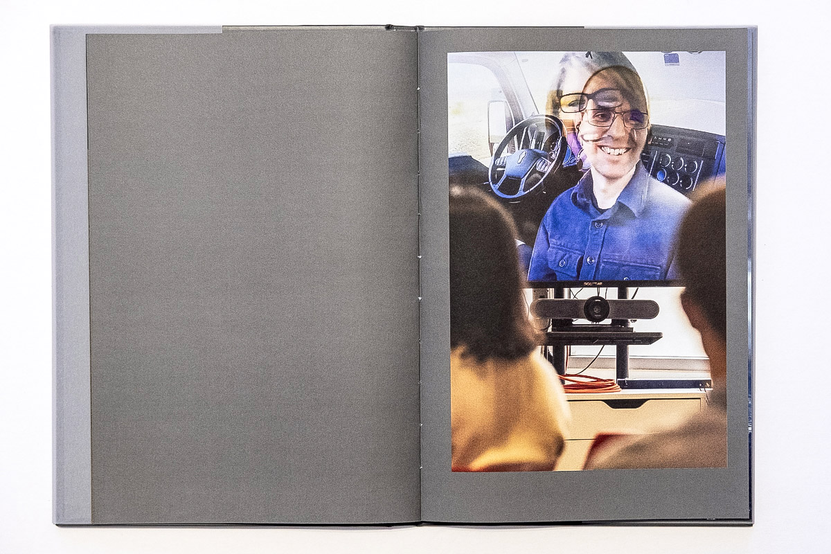 One of the persistent visual themes throughout the project is a concern with blue. Blue light is of course the much-maligned emitted wavelength of computer and phone screens. These have been connected with interference with human circadian rhythms, with some degree of ocular damage, and other effects. One of the early images of the book is a striking vertical portrait of a man, hands in front of face, mouth closed, and (perhaps) pensive – the scene taking on hues of blue magenta, from a screen, a video conference?