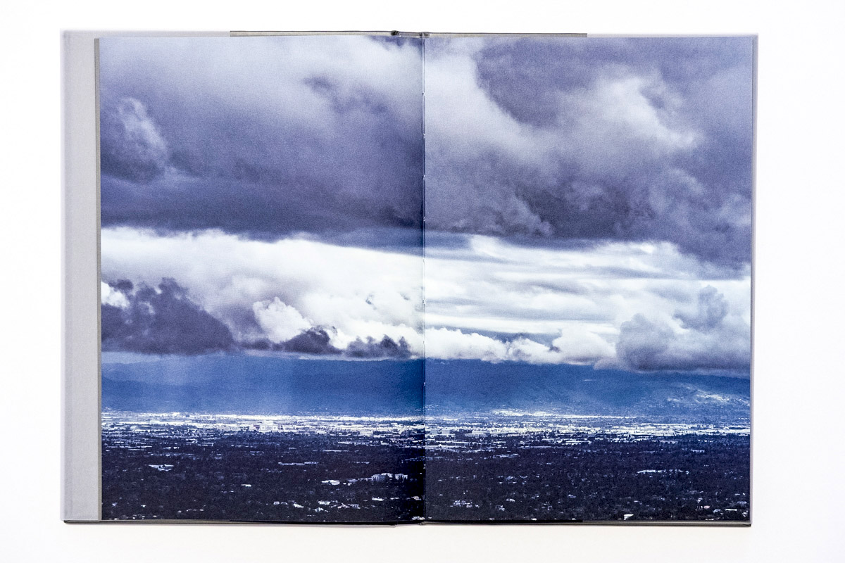 Invited into the book in this unique way, the viewer then encounters 39 images, one of which is an historical image of the Santa Clara Valley, which is described as: “orchards abloom in springtime near San Jose – photographer unknown.” The rest of the images are in color, set against grey pages, sewn together with an exposed binding enveloped in thick cardboard covers. Indeed, it is with the first image – of two men in hats at the bottom of the frame looking out, seemingly surveying, or content, with the verdant valley below – that the viewer begins to understand Voss’ idea even better, this notion of “haunting” that he implies and that becomes clearer throughout the book. This book is about a place that has been and continues to be a palimpsest of, if not “binary,” then dialectical oppositions, of human labor and industrial capacities. Voss hints at this in his text that concludes the book as well. The book’s title comes from Malcolm Harris’ Palo Alto: A History of California Capitalism and the World: “Palo Alto is haunted,” writes Harris.