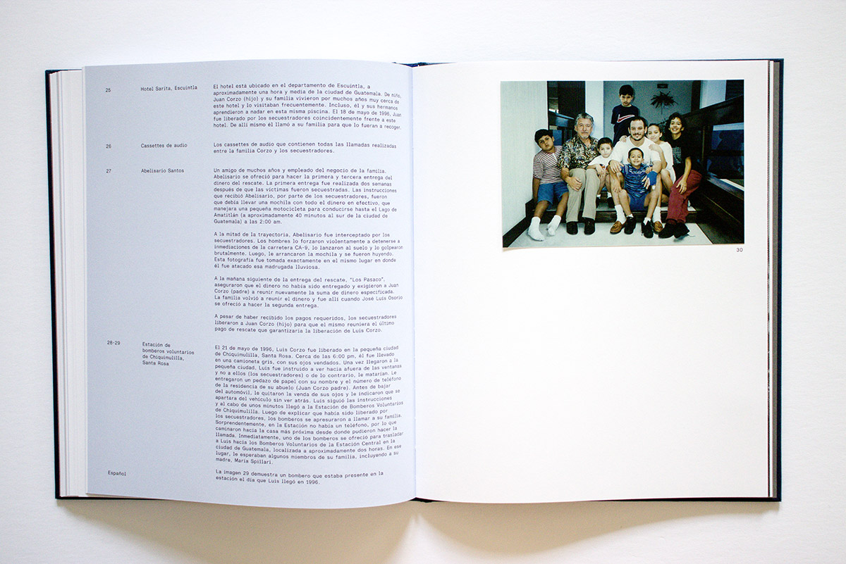 It is a good sign when you start looking at a book and cannot put it down. That is what happened to me with Luis Corzo’s photobook, Pasaco, 1996. Corzo uses photos and texts, in English and Spanish, to tell the story of his and his father’s kidnapping for ransom in Guatemala. A gripping narrative, laid out in spare, just-the-facts, bare-bones style, it reminds me of Truman Capote’s In Cold Blood.