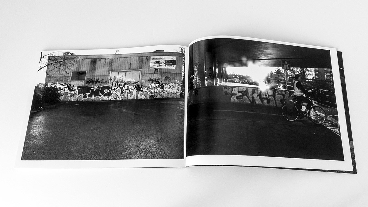 Yet, even as these works help define the neighborhoods in which they exist, they are often overlooked. In the pages of Visible Voices, Mukerjee’s monochrome photographs draw attention to these often-overlooked statements. In some cases, graffiti helps reimagine the spaces as something fantastical; rectangular metal structures can be reimagined as nervous looking robots or an iconic Volkswagen microbus. Other times, artists provide expressly stated political commentary, spray painting in English, for example, “Fuck WHITE M*N!” on the side of a seemingly random building. Other times, the meaning of the stylized letters remains unclear, but nonetheless fundamentally alter the feeling that a grand and arched train station entrance would otherwise inspire. Yet, even when the meaning remains unclear to the average passersby, these paintings work individually and collectively to contest what a place means, who it is for, and the purpose it serves.