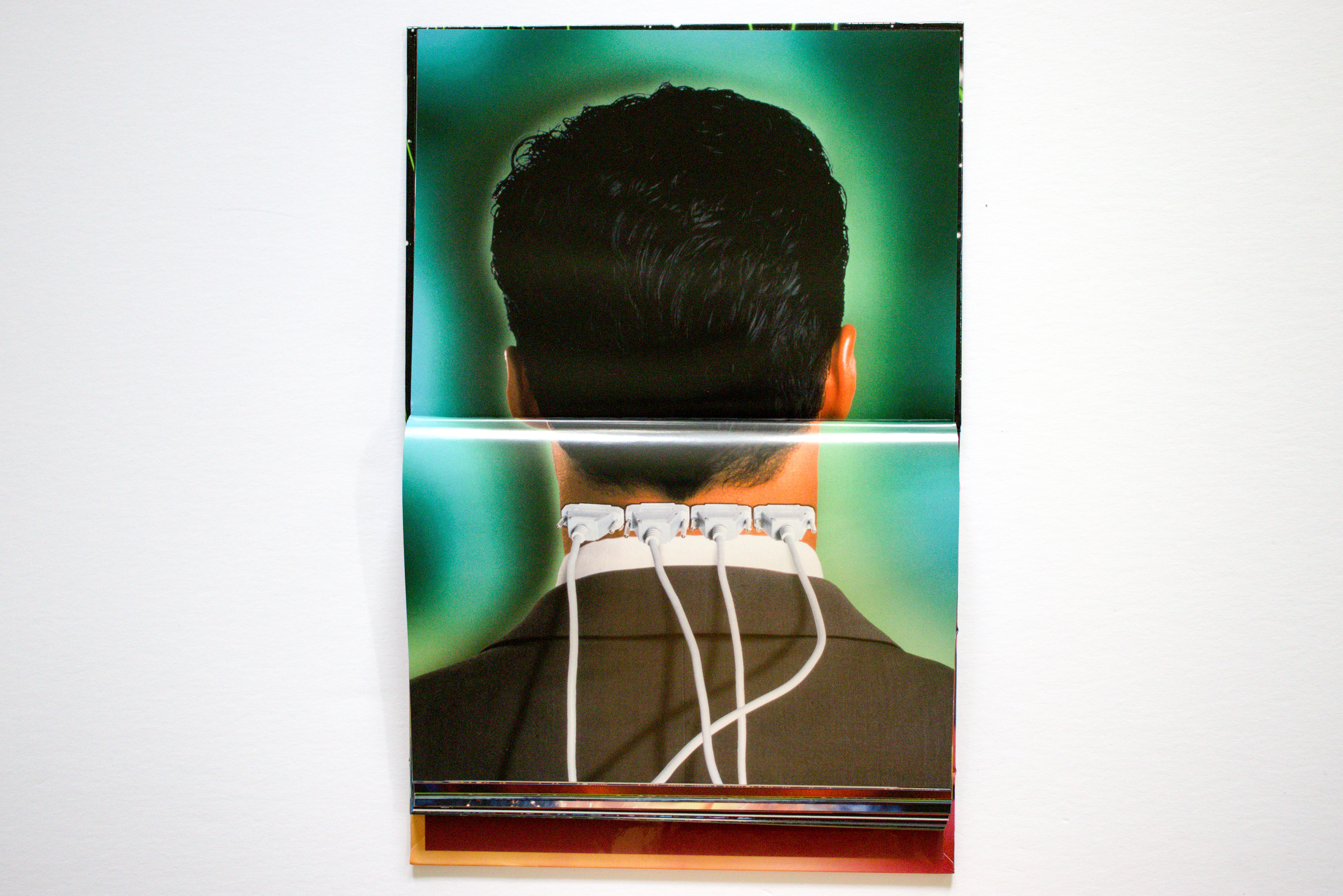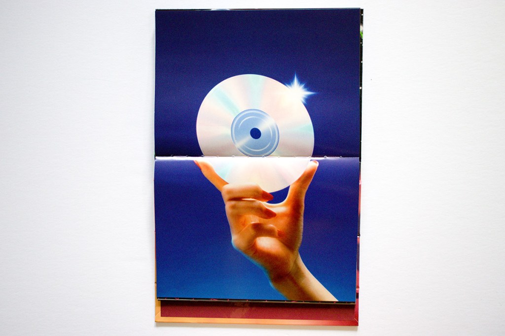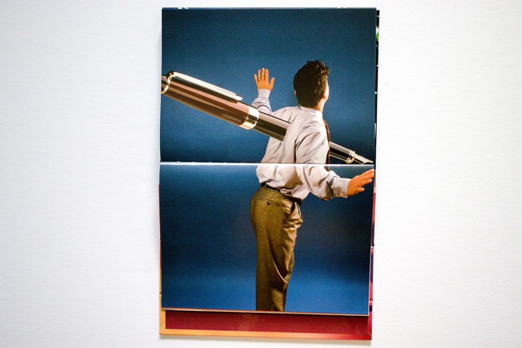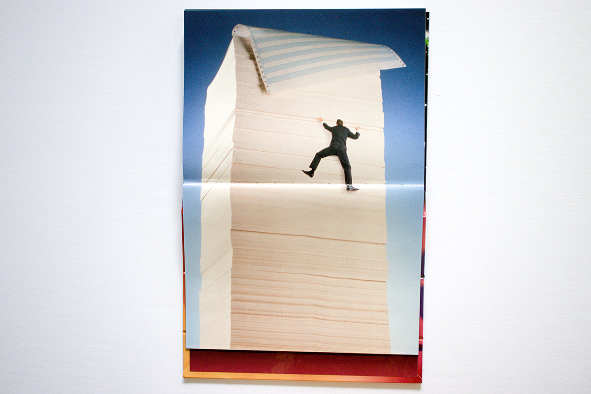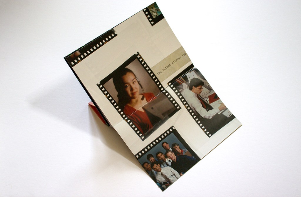 The book’s front cover features an innovative design that I have not seen before in a photobook. It folds over on itself and locks into place with a magnet to create a viewing stand for turning the pages horizontally, just like a flip chart used at a workplace team meeting. Génial.