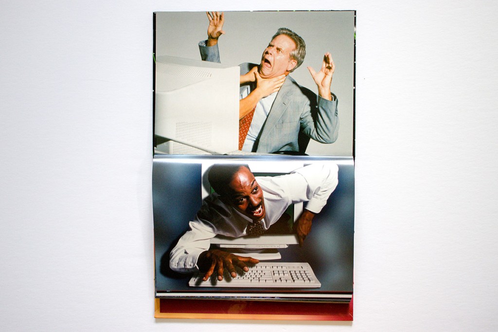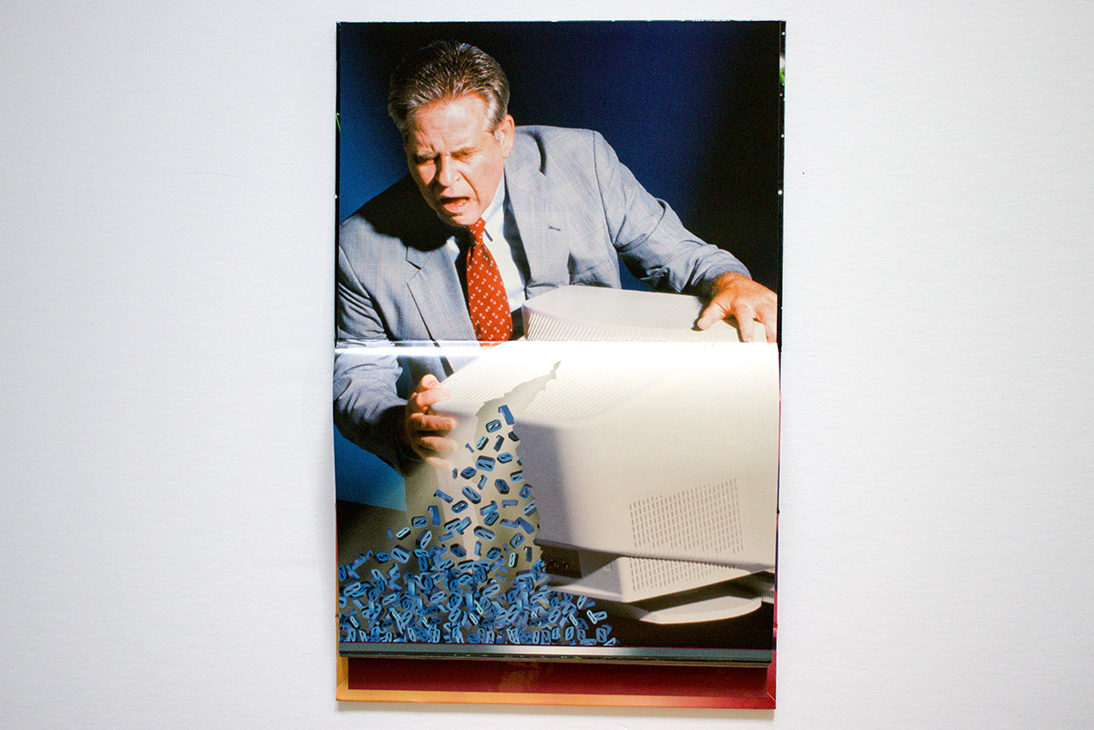 Many of the photos read like scenes from a low-budget B series horror movie. You see computers as giants and people as midgets, computers replacing human body parts, computers wired to people, and computers attacking people. You see humans overdosing on and dying from too much computer use, humans speaking to computer in binary code, and humans controlled by computers.