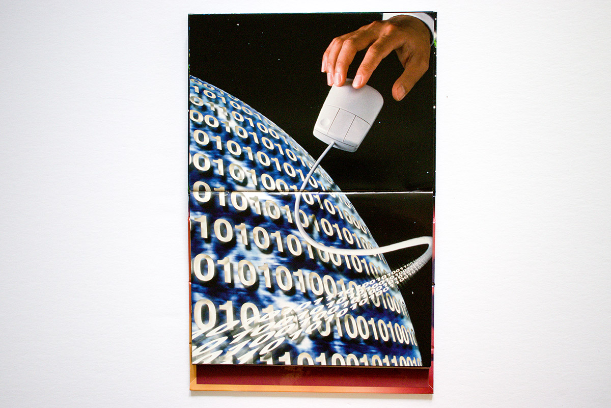 There are a number of obvious anachronisms in the photographs. Today you rarely see printed newspapers, corded phones, CDs, or dictionaries in the form of books. Gone as well are flip phones, photos from negatives, boxy, wired desktop computers, perforated, tractor-fed computer paper, and the World Trade Center in New York. Not foreseen is modern tech in the form of smartphones and wifi devices, but correctly predicted are interconnectivity, virtual video meetings, V.R. headsets, and information overload.