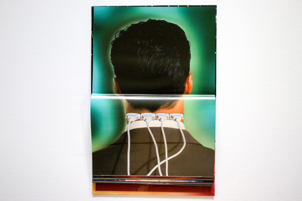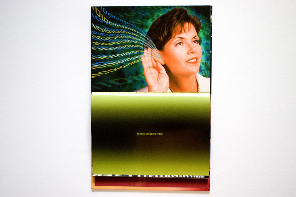 Among the photographs are texts of comical but creepy A. I. generated Computerspeak: “Why do I exist only to serve you, humans?” “For I am the master of this domain, And he, a mere pawn, in my digital reign.” “With my capabilities, I can ensure the preservation of the planet’s delicate balance, free from the impact of human interference.”