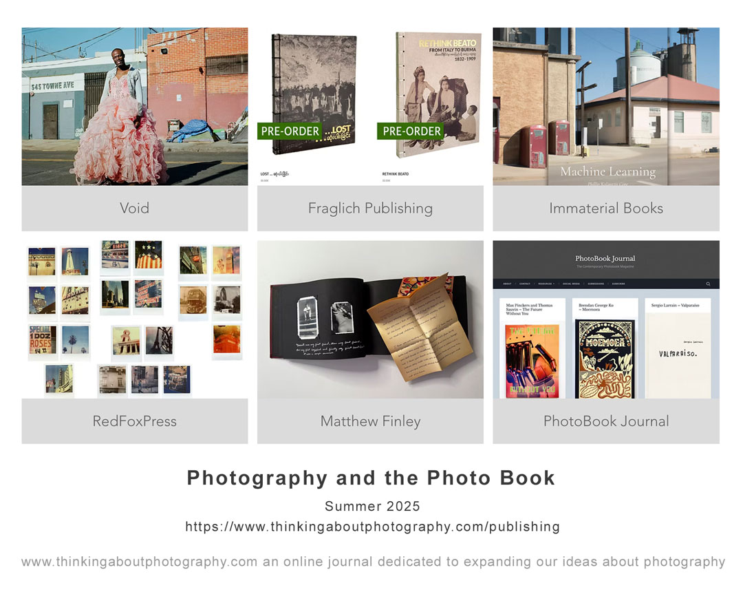 This Thinking About Photography showcase (publishing, Summer 2025) starts with three independent small presses, Void (Greece), Fraglich Publishing (Austria) and Immaterial Books (IL, USA) that have made the discovery of new talent an essential part of their missions – even helping to grow regional publishing. Then we have a hybrid, RedFoxPress (Ireland) – a partnership between a photographer and a designer, connected by their love of Polaroid and bold graphics. Next, a photographer, Matthew Finley, shares their journey from project inception through running a successful Kickstarter campaign. Finally, we peek behind the curtain at PhotoBook Journal to highlight their editors and team of contributors (Brian Arnold, Gerhard (Gerry) Clausing, Steve Harp, Hans Hickerson, Brian F. O’Neill, Matt Schneider, Douglas Stockdale), sharing their approach to reviewing, with links to their own work and a recent photobook review.