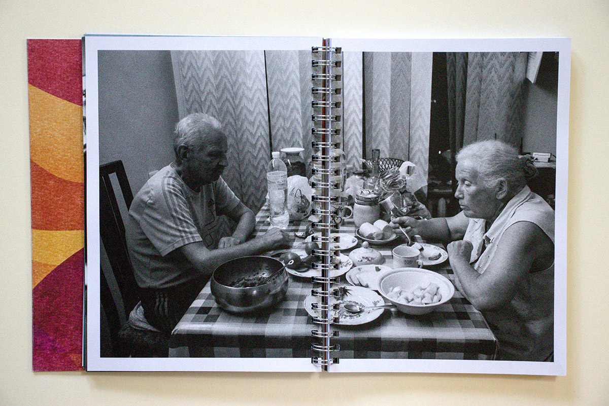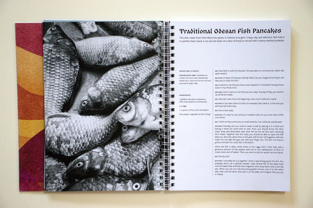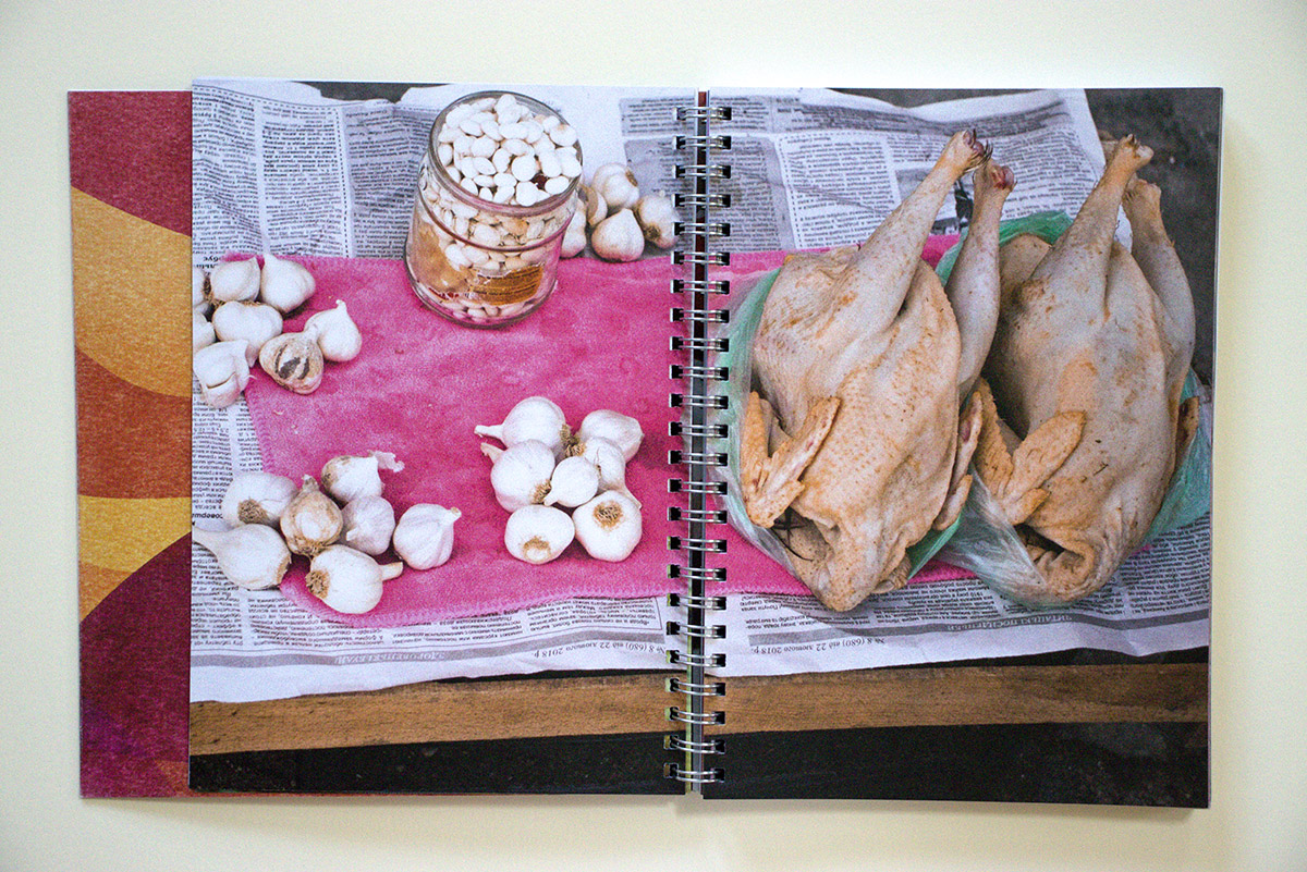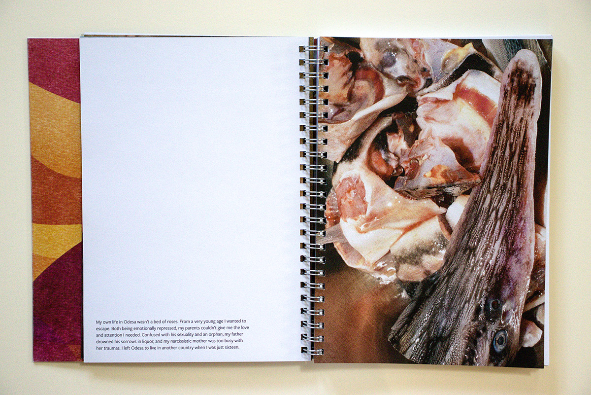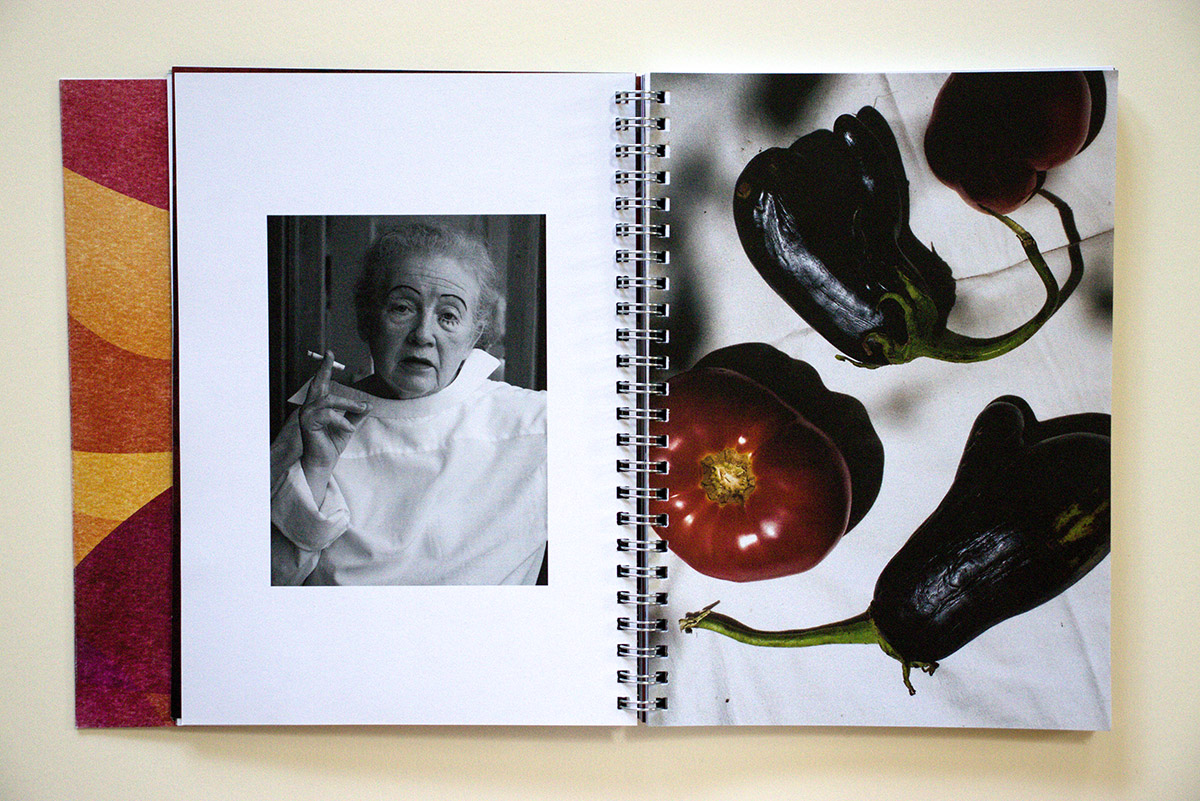 In terms of the book’s design, its spiral binding totally works with the idea of a recipe book. The photos are in color and black and white. There are full bleed layouts and photos with wider or narrower margins. There also appear to be several double exposures. It all meshes seamlessly to support the narrative.