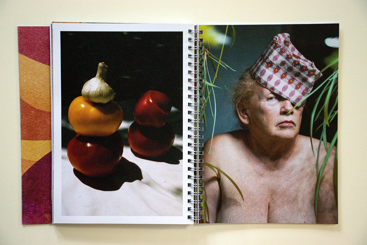 The visual themes are established in the opening pages. You see photos of a table laid for a meal, vegetables used to make aubergine caviar, and Blanco’s mother posing in a dress filled with tomatoes. In a short text, Blanco evokes her memories of living in communal housing in Odessa as a young girl and the Odessa Black Sea lifestyle, and she explains why she left at age sixteen. As she does, other visual themes emerge: the sea, the water, the beach, and more cooking ingredients – eggs, garlic, whole chickens, fish. You also see Blanco’s mother naked on the beach, caring for her ailing husband, and posing as an actress with a cigarette.
