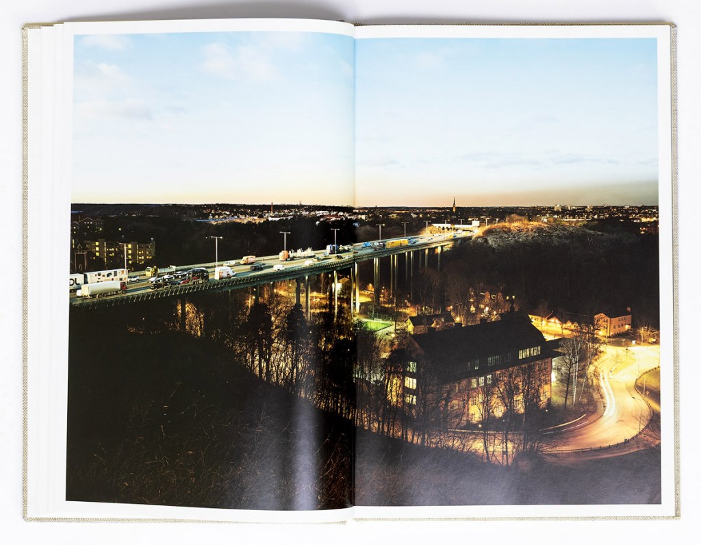 One of the better examples of the drama and tension in these images can be seen in Plate 8. This is an image taken on January 21, 2020 in Essingeleden, a nexus of rail lines and elevated highways within Stockholm. The foreground and background are presented in deep night, quiet and peaceful, whereas the sky above is a curious bright blue. A shadowy figure climbs the hill in the dark foreground, adding a sense of foreboding. Then, in direct contrast to the quiet and perhaps slightly spooky scene, a very crowded elevated highway streaks across the middle of the scene. It is illuminated by a full sun, and its noise and congestion clash with the quiet of the foreground and background – quite a thought-provoking composition.