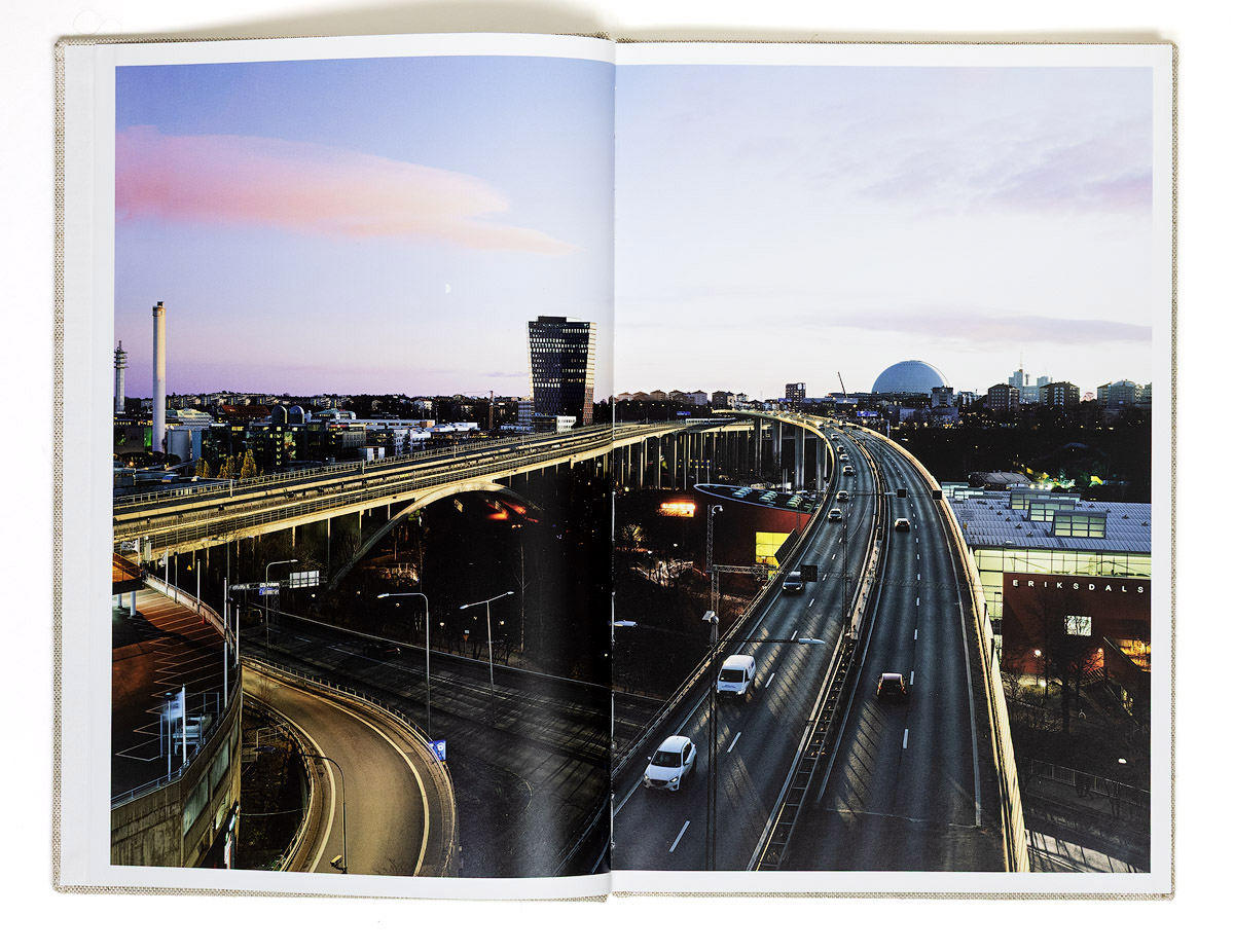 One of the better examples of the drama and tension in these images can be seen in Plate 8. This is an image taken on January 21, 2020 in Essingeleden, a nexus of rail lines and elevated highways within Stockholm. The foreground and background are presented in deep night, quiet and peaceful, whereas the sky above is a curious bright blue. A shadowy figure climbs the hill in the dark foreground, adding a sense of foreboding. Then, in direct contrast to the quiet and perhaps slightly spooky scene, a very crowded elevated highway streaks across the middle of the scene. It is illuminated by a full sun, and its noise and congestion clash with the quiet of the foreground and background – quite a thought-provoking composition.