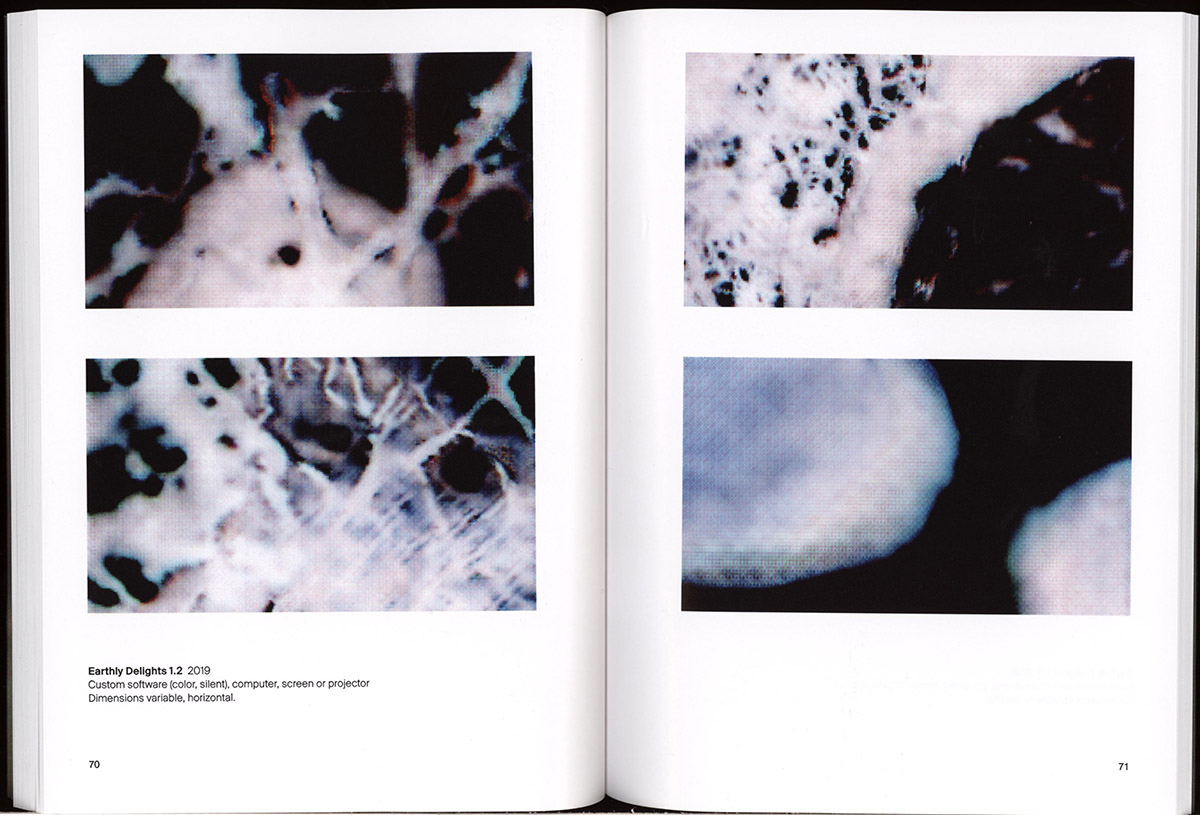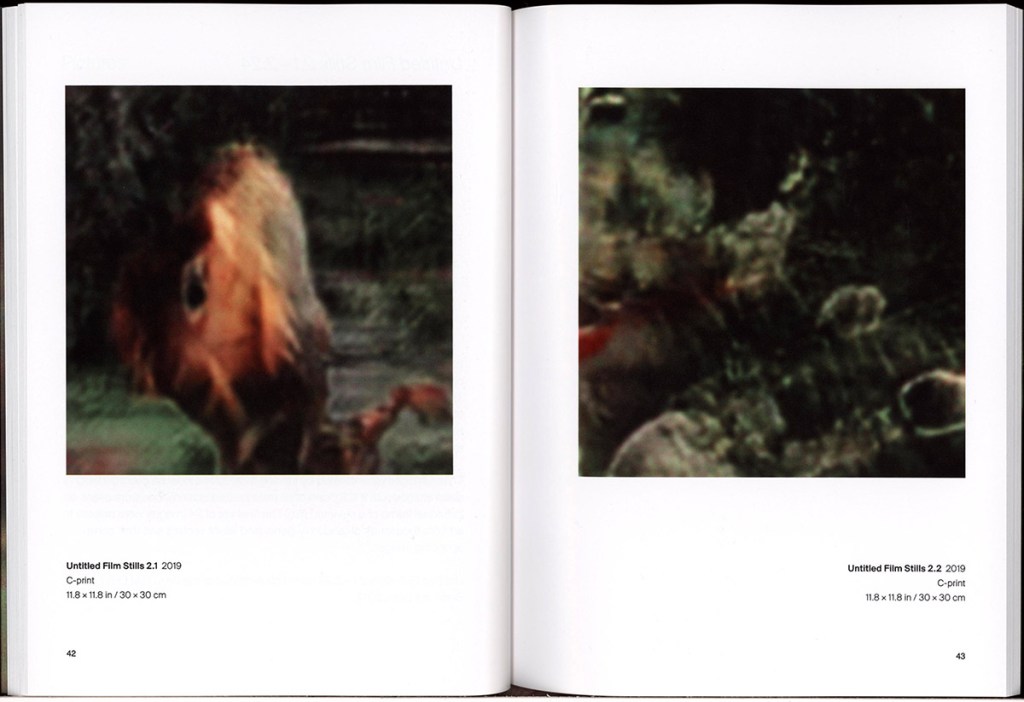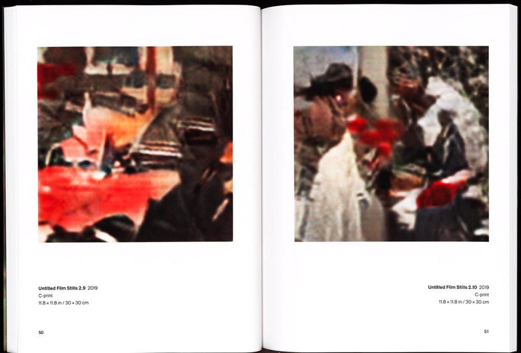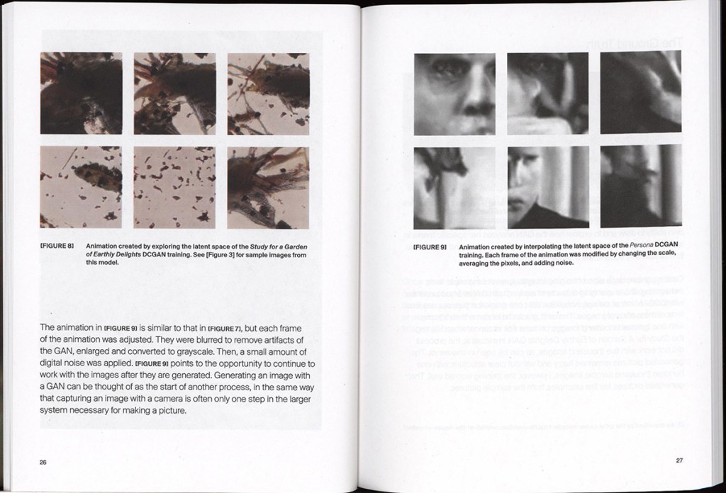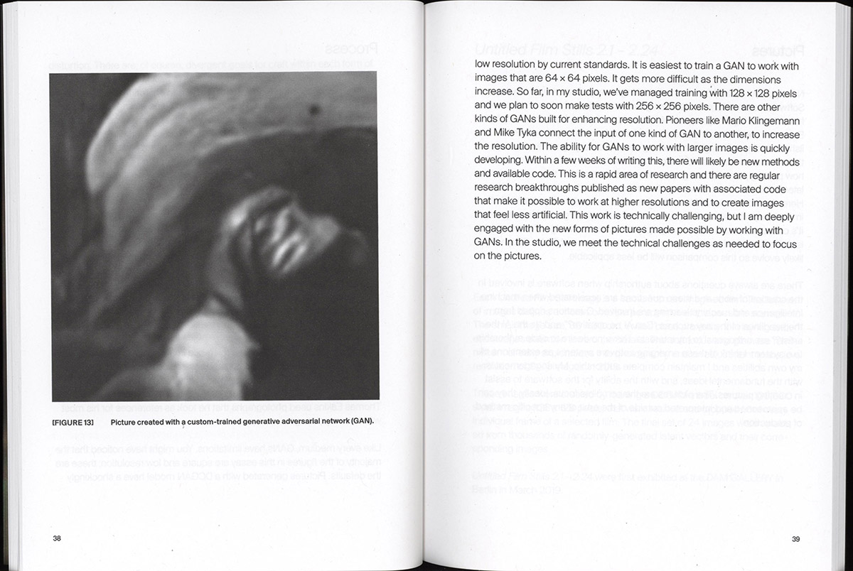 The several pages shown below present examples of Reas’s output images. All of them are new subjects, but based on previous input. They all display a sufficient amount of ambiguity to let the viewer surmise about possible meanings. While the latest AI images nowadays are able to generate more detailed pictures than double pages 24 to 25 shown below, the ambiguity and intrigue of images shown on pages 94 to 95 are as perfect as can be wished for. I chose to review this book because of the unmatched dreaminess of these early AI pictures. The volume contains two series of “Untitled Film Stills” and one series of “Earthly Delights.” One’s imagination can go wild!