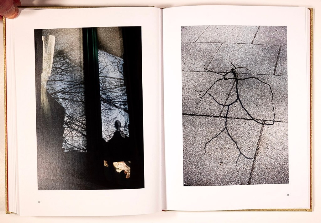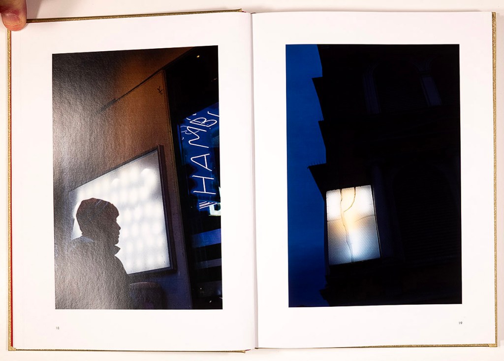 Having reviewed two previous monographs by Groht (Nice, Not Nice in 2021 and Due Occhi in 2024) which consisted of (primarily) black and white images, it was a joy to experience his use of color in the images of Insight Grindel. The hues are bright and saturated without being at all gaudy or overpowering. His presentation of color in darkness (the many night scenes and lights in darkened spaces such as shop windows) is beautiful. Along with the motif of the crow or raven, the recurring presence of gold adds a sense of vividness in the sights being depicted.