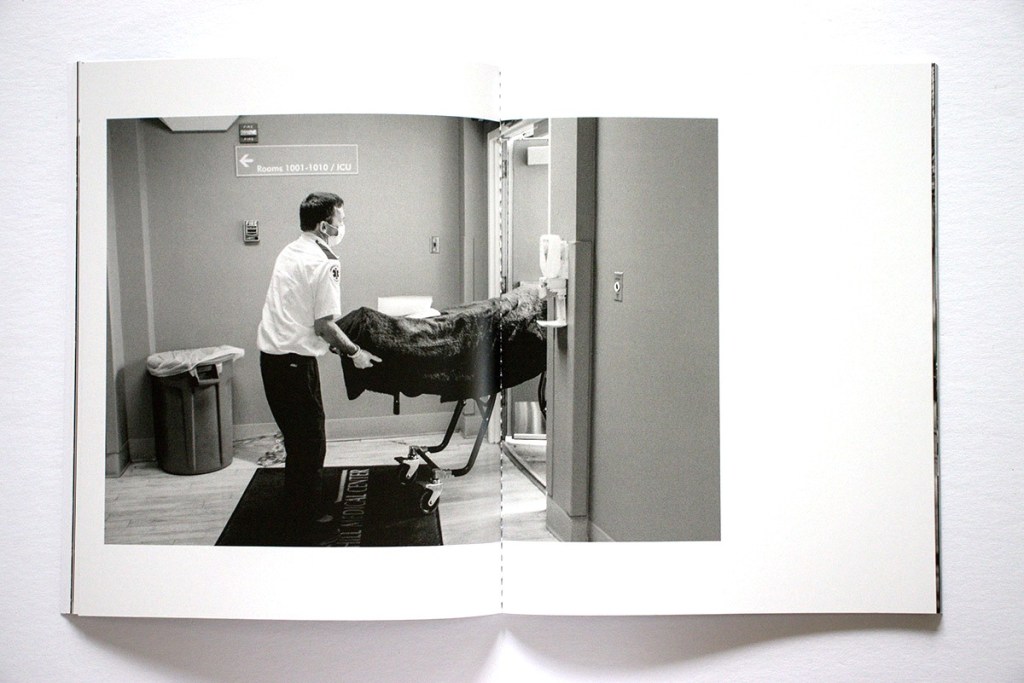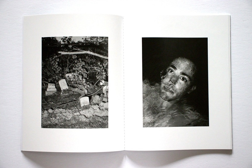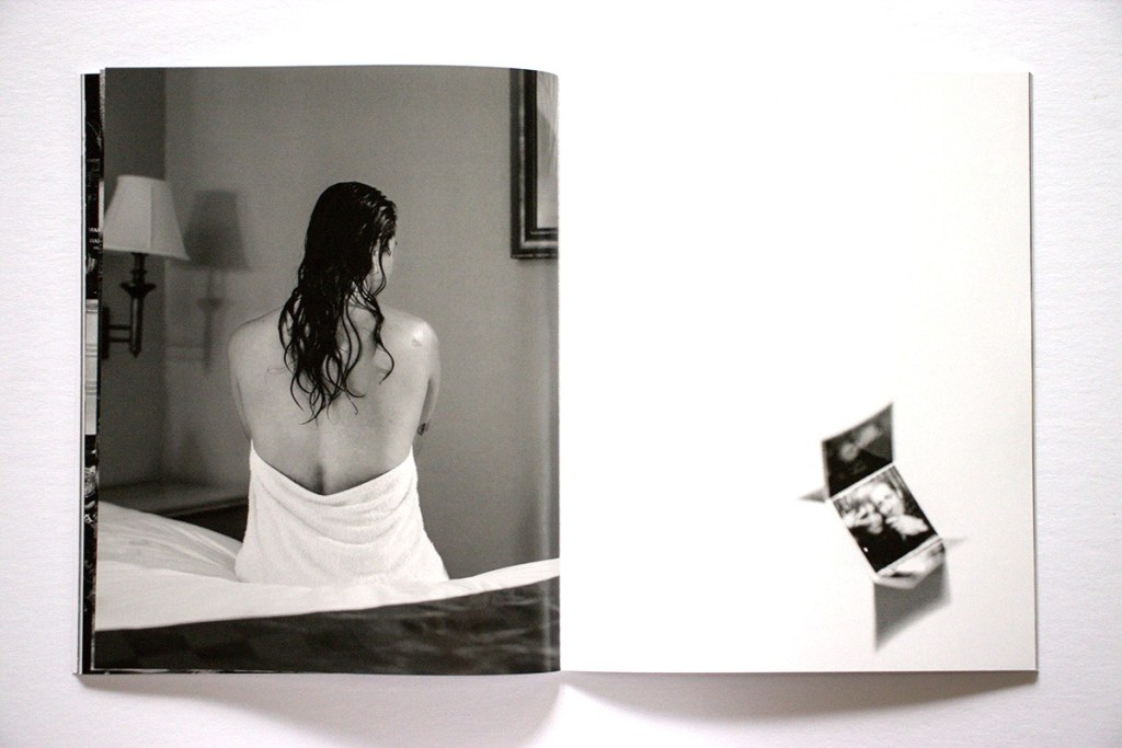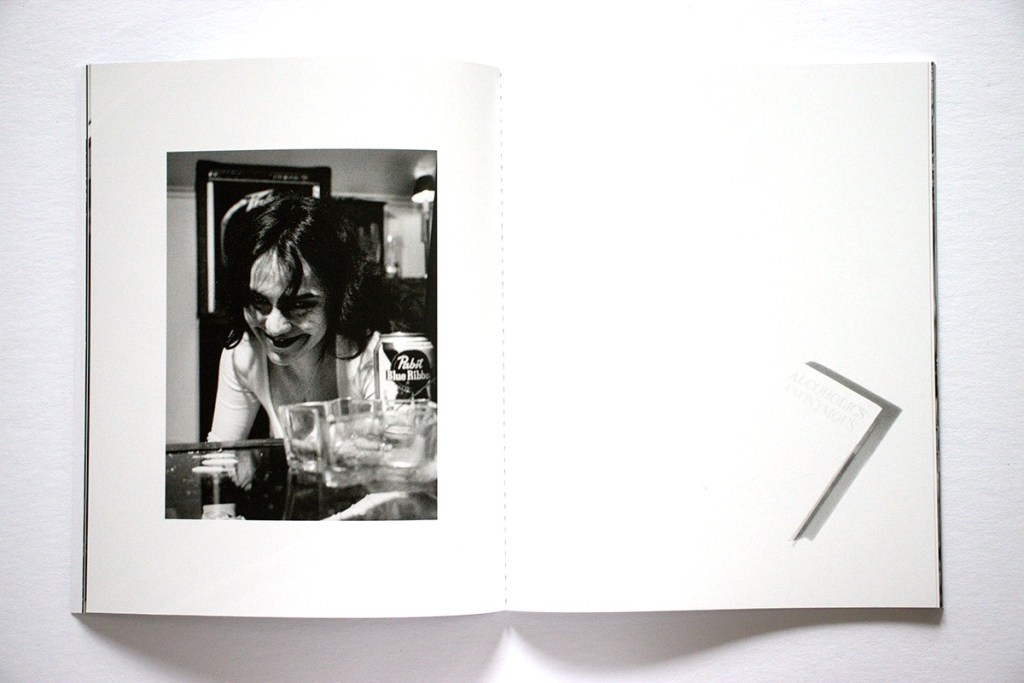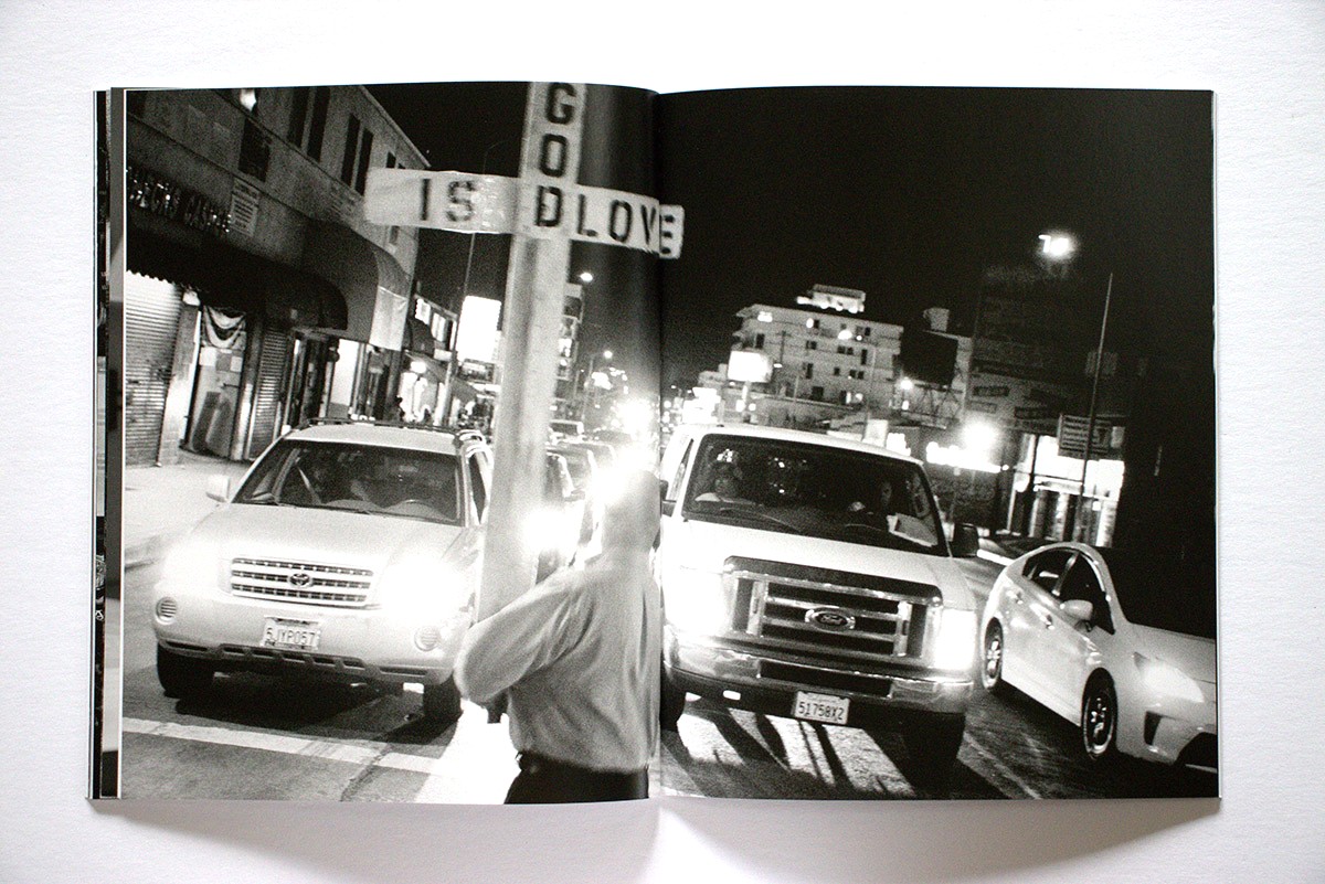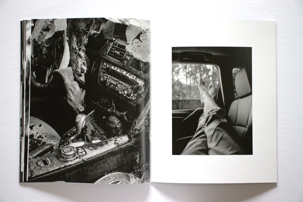 Several themes are developed in the book: sardonic observations of contemporary life, a dark take on our current social and cultural moment, and glimpses of first-person lived moments, including absurdity, intimacy, trauma, excess, and quiet reflection. In terms of social commentary, we see a pile of asphalt chunks, a ragged, lost-looking (homeless?) man, medics placing a man on an ambulance gurney, a man holding up a God Is Love cross on a street at night, and the trashed interior of a wrecked car. As for more personal views we see a young woman smiling conspiratorially over a table of drinks, a blurry hotel bedroom, someone’s feet resting out the back window of a parked car, and a hand-written welcome home note with a heart.