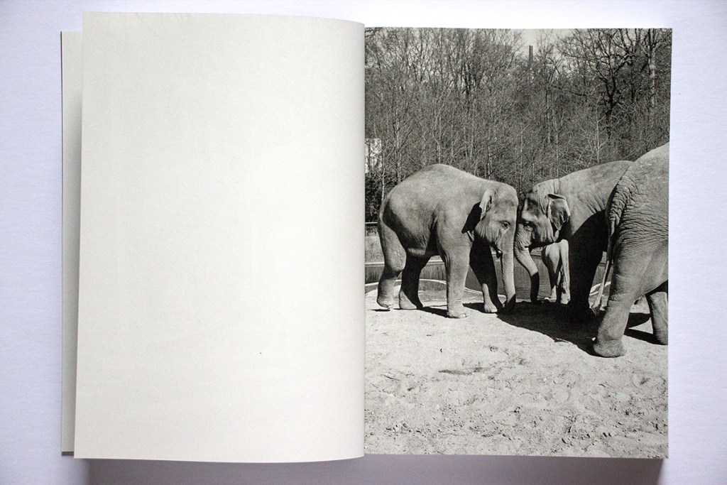 In the first section, we see matter-of-fact black and white photos of Asian elephants in a zoo. We see them eating, socializing, and interacting with their surroundings. We also see a young elephant calf exploring and with its mother.
