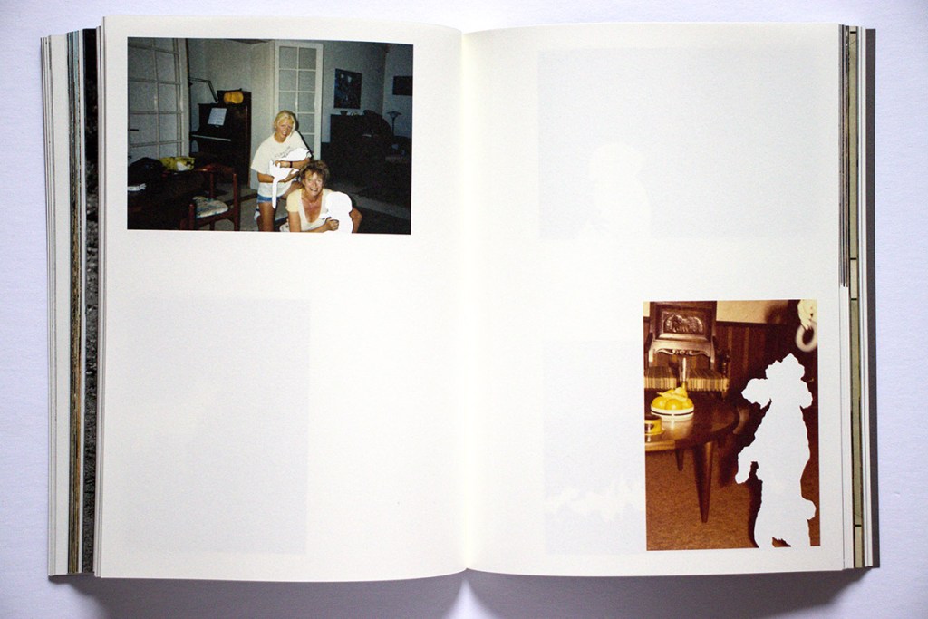 The fifth section is a series of black and white and color family snapshots, mostly including animals – cows, dogs, cats, geese, a horse, a fish – that have been cut out, leaving a blank silhouette.