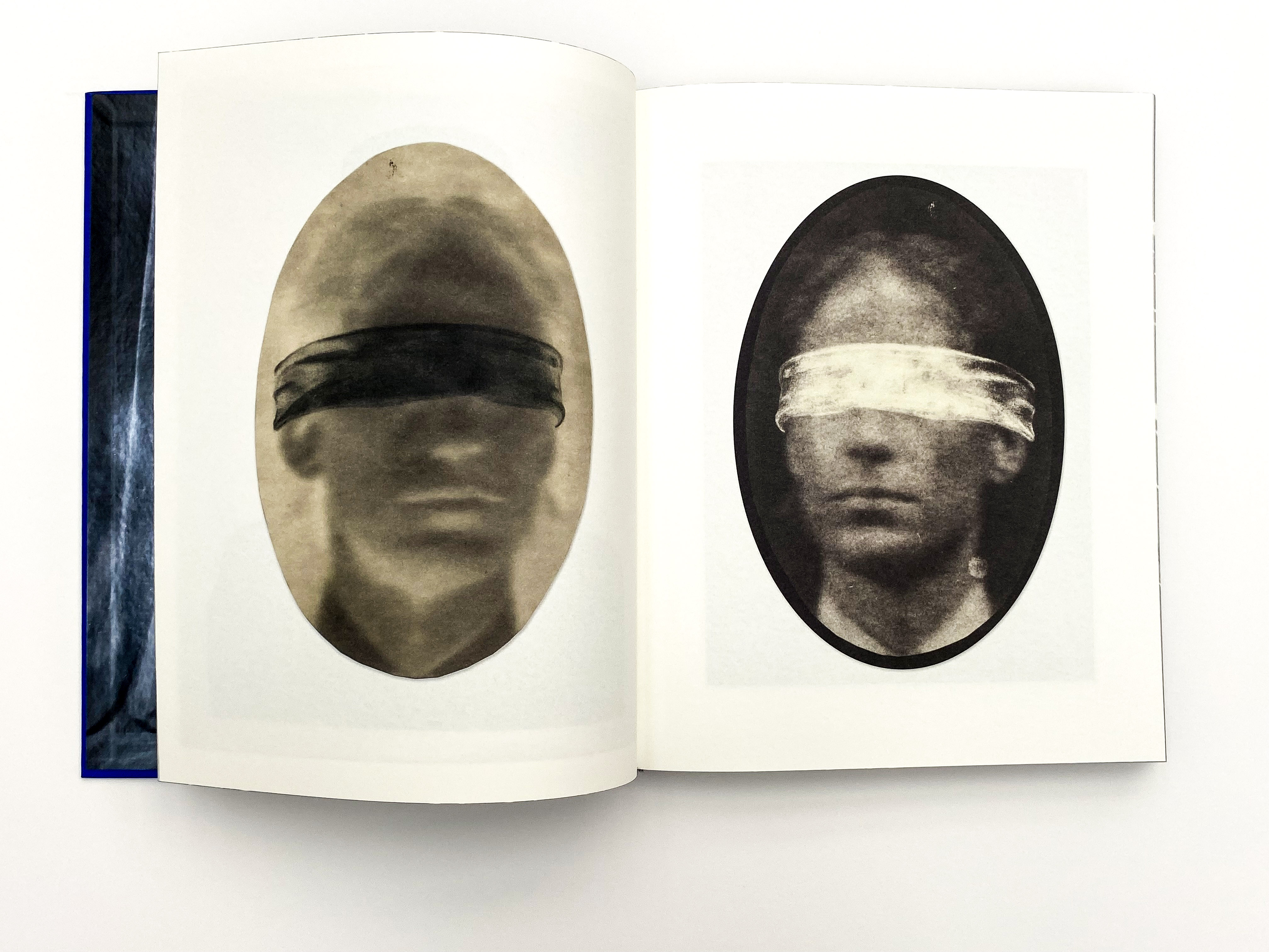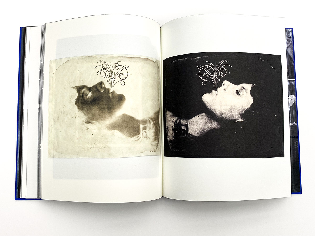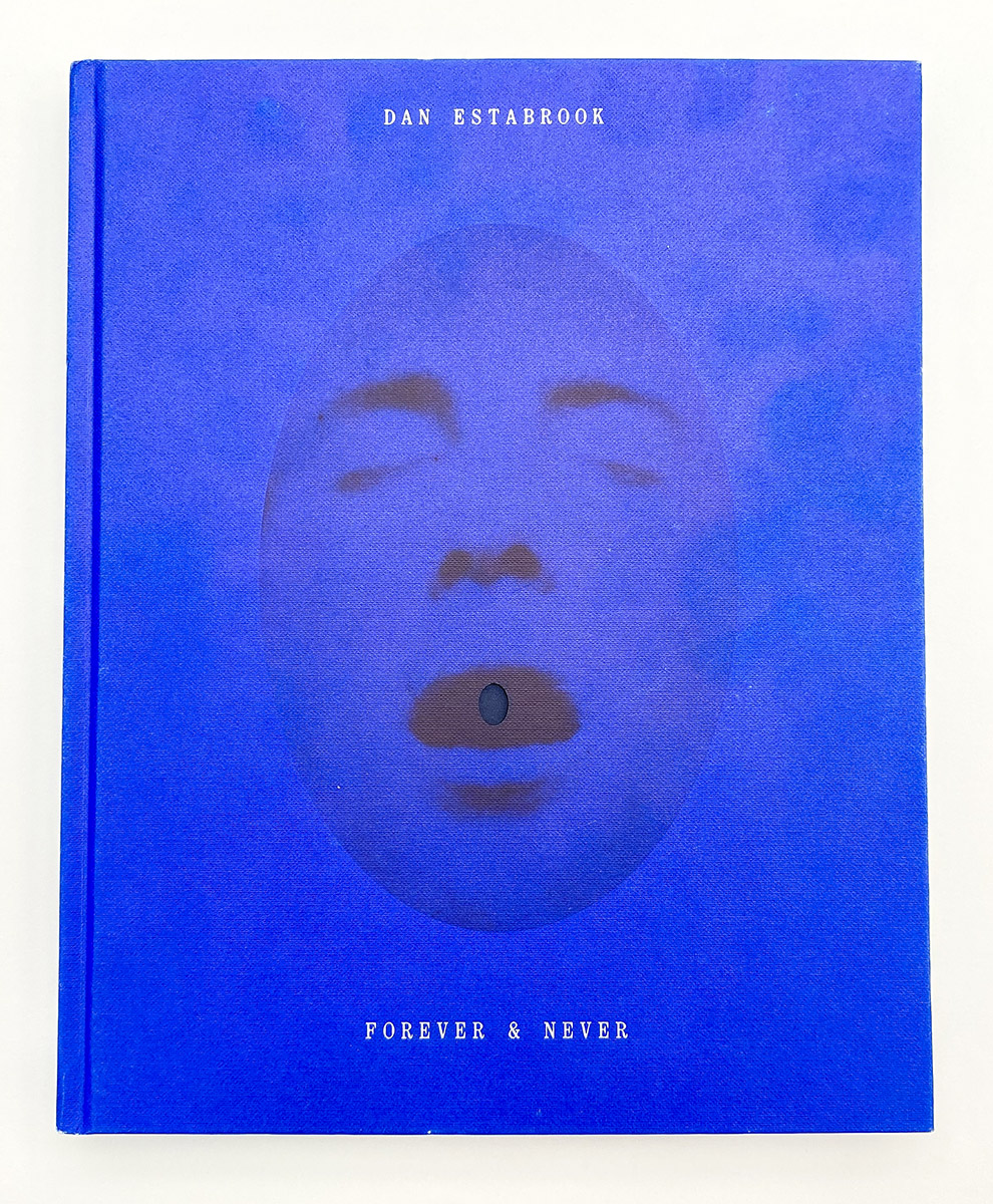 Forever & Never is a playful book, full of clever sleights of hands, a style of performance that feels akin to a middle school play, and complex ideas about the mysteries of life. Beautifully designed by Elana Schlenker, the book has a glowing cobalt blue cover, a mask of the artist’s face stenciled in the middle with a small hole burrowed between his lips. The bound pages are printed to make them look both like a tabletop stained with silver nitrate and a primitive map of the heavens. Opening the book, the endpapers are glossy and radiant pages depicting the artist’s studio, an illuminated mirror at the heart (appearing as though originally photographed in a wet collodion process). The following pages, a more traditional matt finish, illustrate a narrative of a man performing small, staged scenarios that explore the elusive mysteries of love, childhood, fantasy, death, mysticism, and photography. The book is divided into three chapters – Little Devils, Ghosts and Models, and Broken Fingers – and each of these is composed with pictures Estabrook made between 1999-2024 (personally, I love when photographers can demonstrate so much patience with their vision). Conceived as objects as much as images (one of my favorite attributes of alternative process photography), Estabrooks photographs use an incredible range of processes – calotype negatives embellished with graphite and an Xacto knife, rich and lovely palladium prints, touches of watercolor, albumen prints mounted on cardboard, and silver gelatin prints reconfigured with bleaches and toners. In his 25 years of photographing, there is one character that repeats throughout, his alter ego, a sort of magician adorned with a top-hat – appearing elusive but relatable, clever and creative, conceived as an everyman experiencing all the complexities of love and life in the 21st century while reflecting on the nature of photography, perception, and history.
