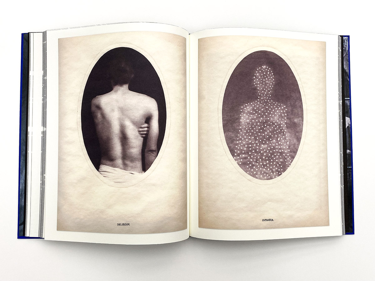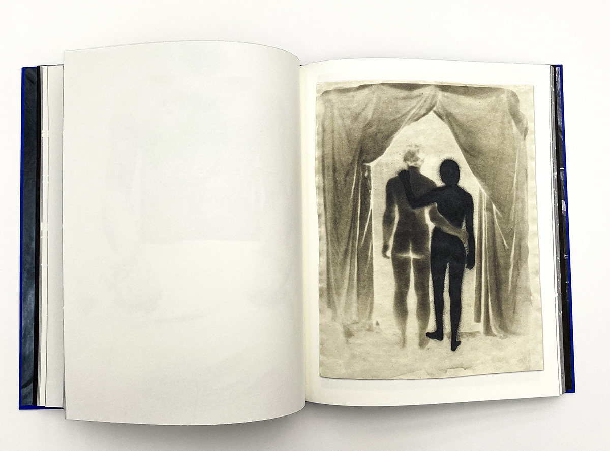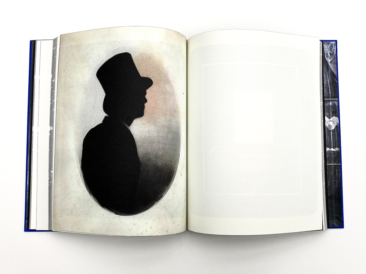 Forever & Never is a playful book, full of clever sleights of hands, a style of performance that feels akin to a middle school play, and complex ideas about the mysteries of life. Beautifully designed by Elana Schlenker, the book has a glowing cobalt blue cover, a mask of the artist’s face stenciled in the middle with a small hole burrowed between his lips. The bound pages are printed to make them look both like a tabletop stained with silver nitrate and a primitive map of the heavens. Opening the book, the endpapers are glossy and radiant pages depicting the artist’s studio, an illuminated mirror at the heart (appearing as though originally photographed in a wet collodion process). The following pages, a more traditional matt finish, illustrate a narrative of a man performing small, staged scenarios that explore the elusive mysteries of love, childhood, fantasy, death, mysticism, and photography. The book is divided into three chapters – Little Devils, Ghosts and Models, and Broken Fingers – and each of these is composed with pictures Estabrook made between 1999-2024 (personally, I love when photographers can demonstrate so much patience with their vision). Conceived as objects as much as images (one of my favorite attributes of alternative process photography), Estabrooks photographs use an incredible range of processes – calotype negatives embellished with graphite and an Xacto knife, rich and lovely palladium prints, touches of watercolor, albumen prints mounted on cardboard, and silver gelatin prints reconfigured with bleaches and toners. In his 25 years of photographing, there is one character that repeats throughout, his alter ego, a sort of magician adorned with a top-hat – appearing elusive but relatable, clever and creative, conceived as an everyman experiencing all the complexities of love and life in the 21st century while reflecting on the nature of photography, perception, and history.
