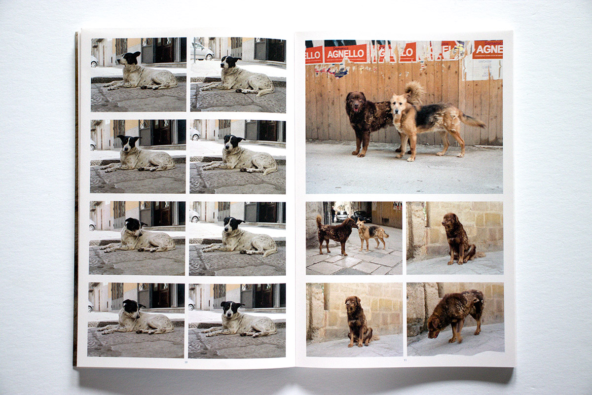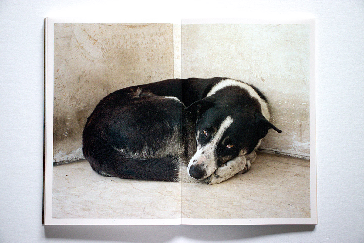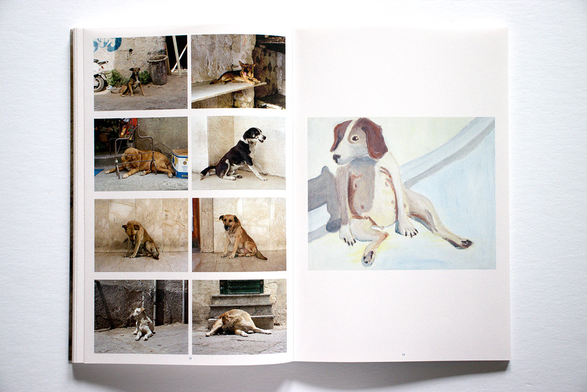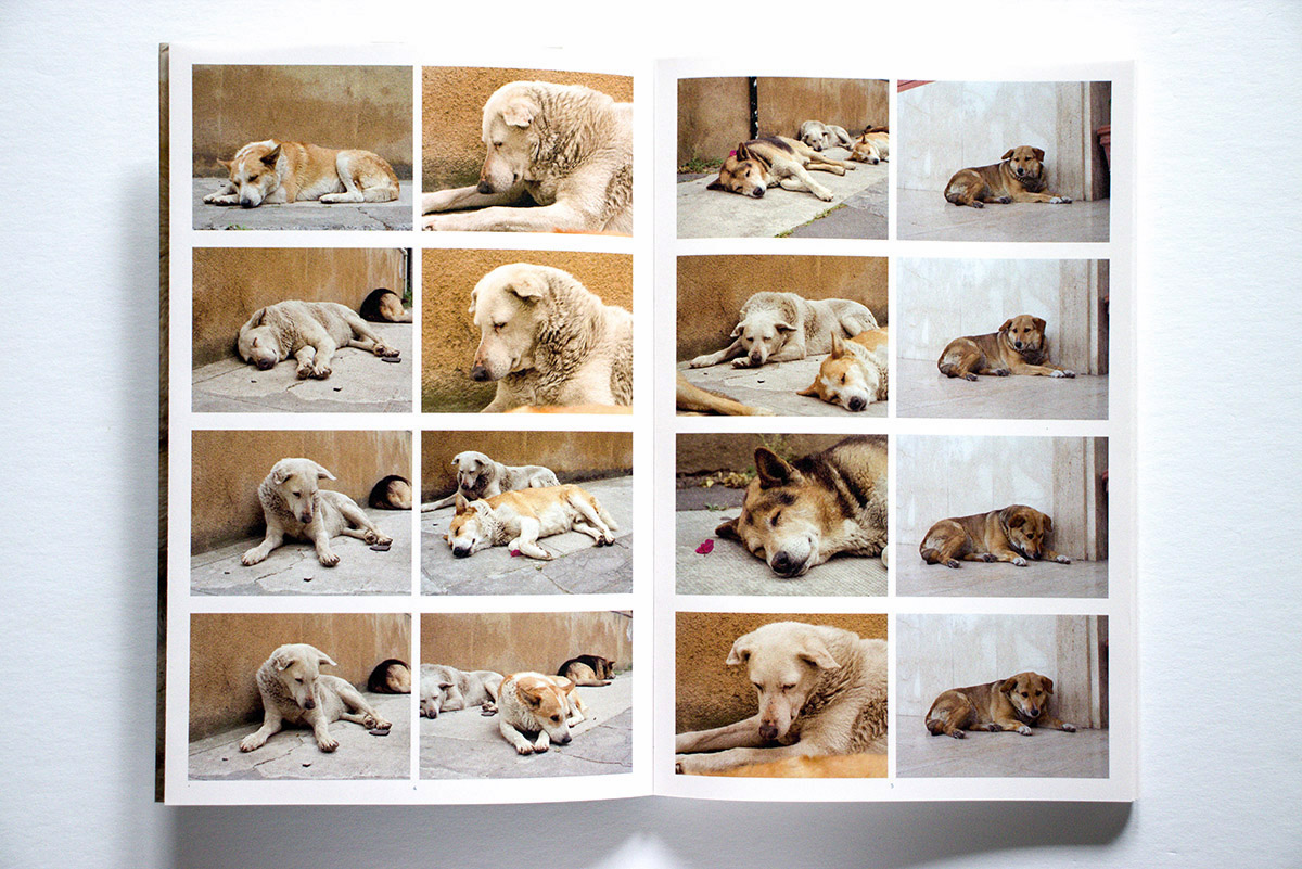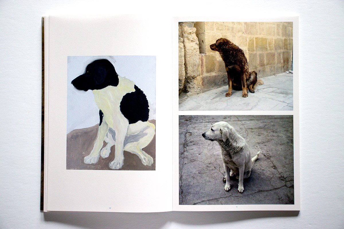 The editing and pacing are nuanced, with themes and variations explored through repetition as well as contrast. The pages are often laid out as a grid of eight, four, or two photographs or sometimes one image on a two-page spread. Three of the images are paintings of dogs that echo the poses of the dogs in the photos.