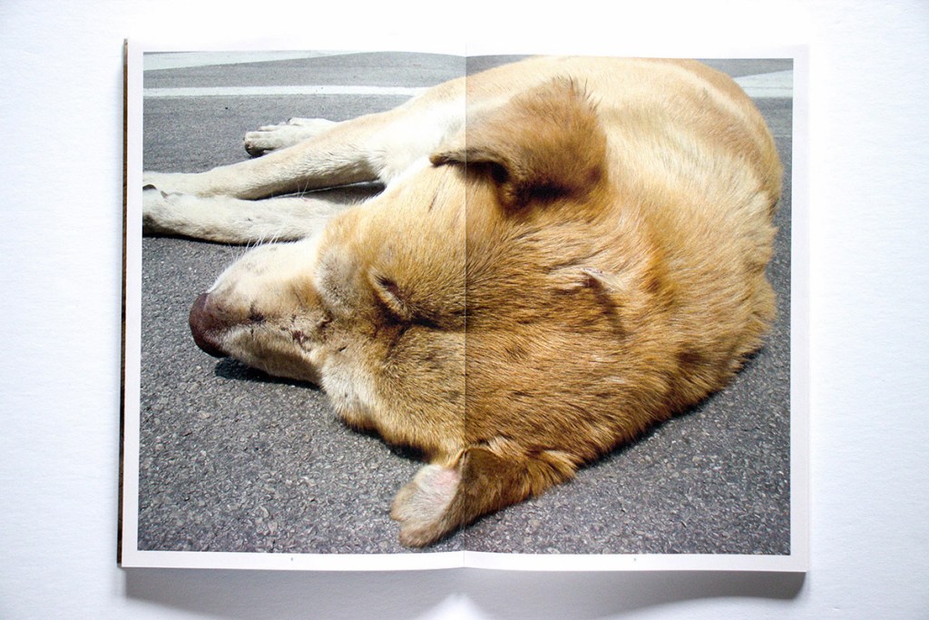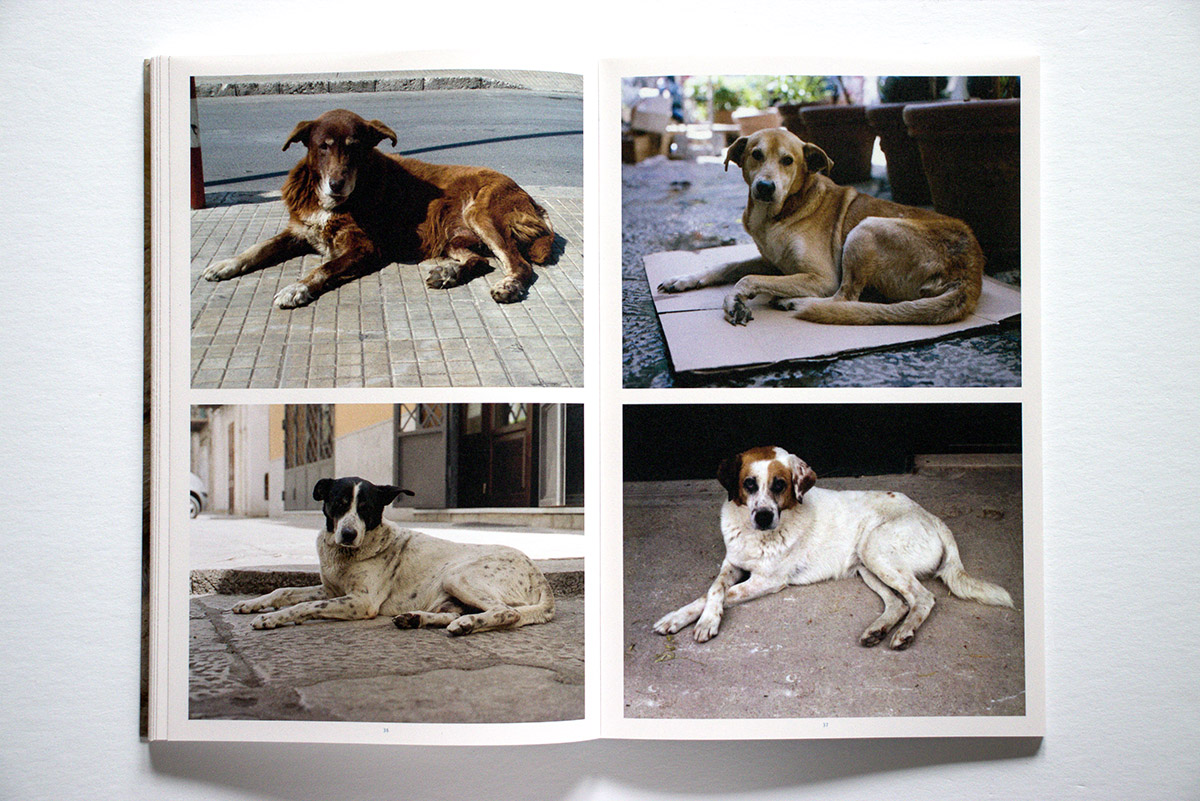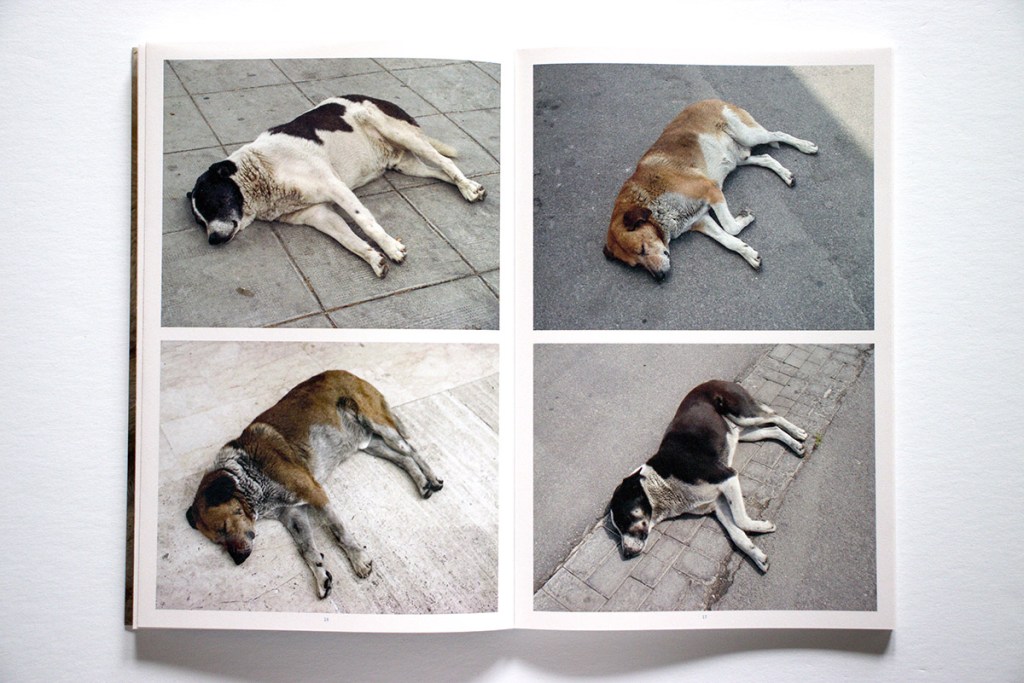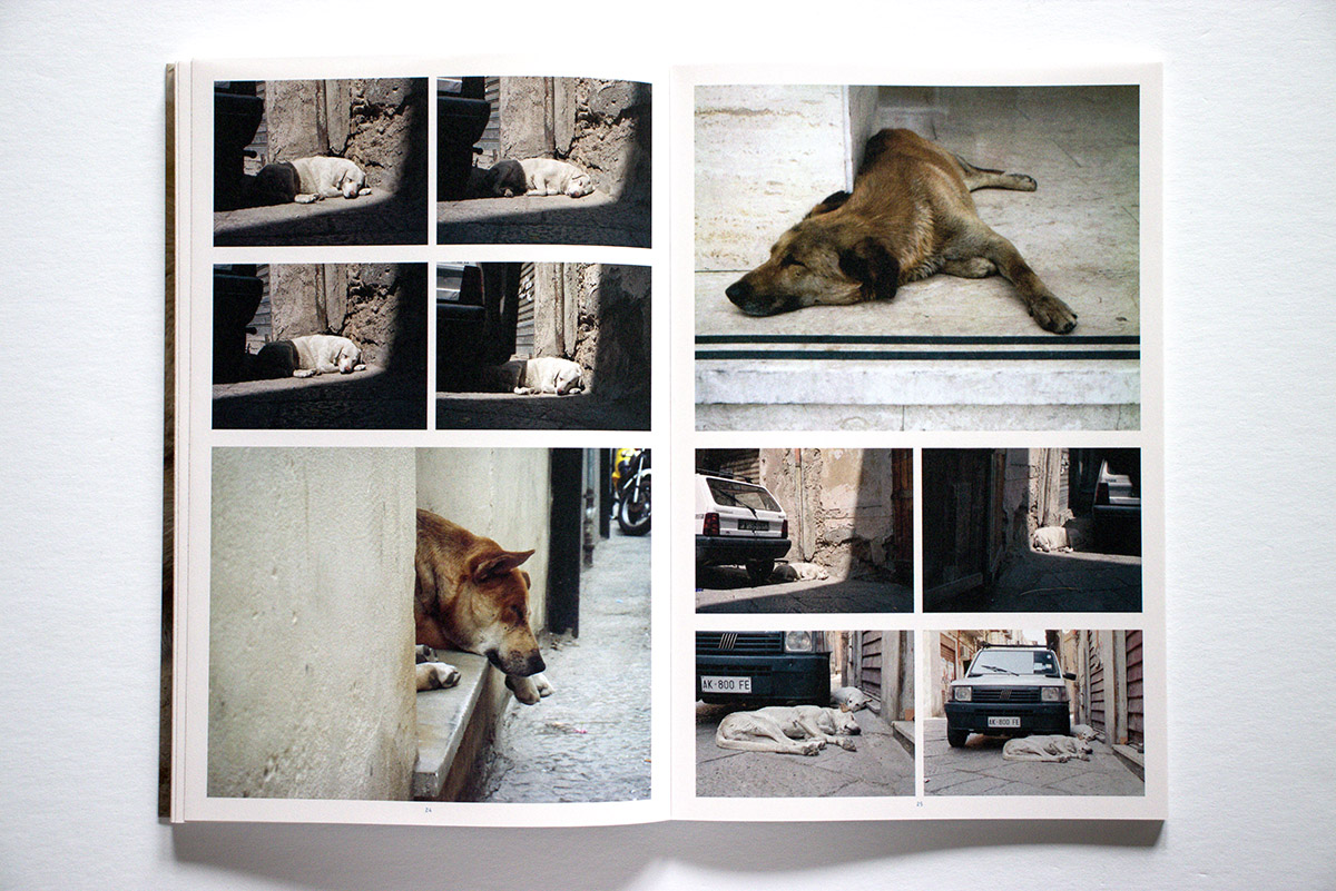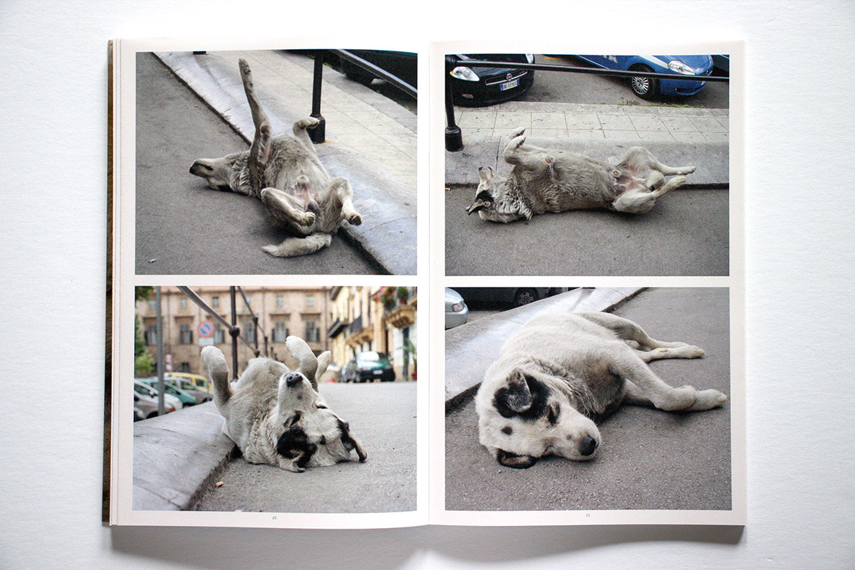 We do not see the dogs interacting with people, and there is only one photograph where a person appears in the far background. It is clear that this is not a documentary reportage on the stray dogs of Palermo. We see no young puppies, for example, and no photos of dogs eating or interacting with humans or other packs of dogs. Instead the dogs are pictured resting and sleeping. They are not aggressive or annoying. They are sympathetic and vulnerable, dignified and worthy of our respect and understanding. They are presented as independent creatures living their lives and freely going about their street-dog business.