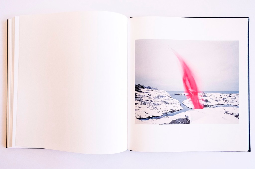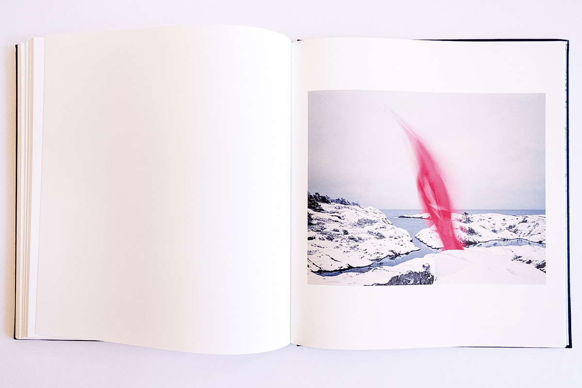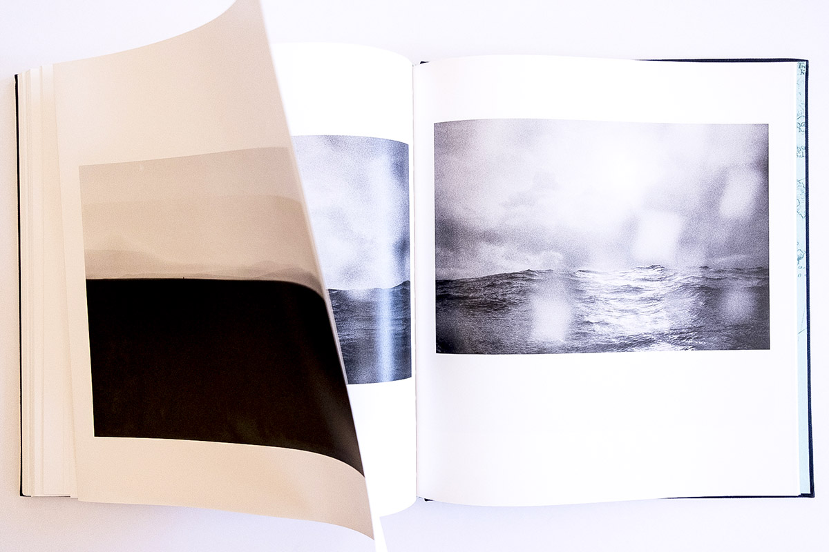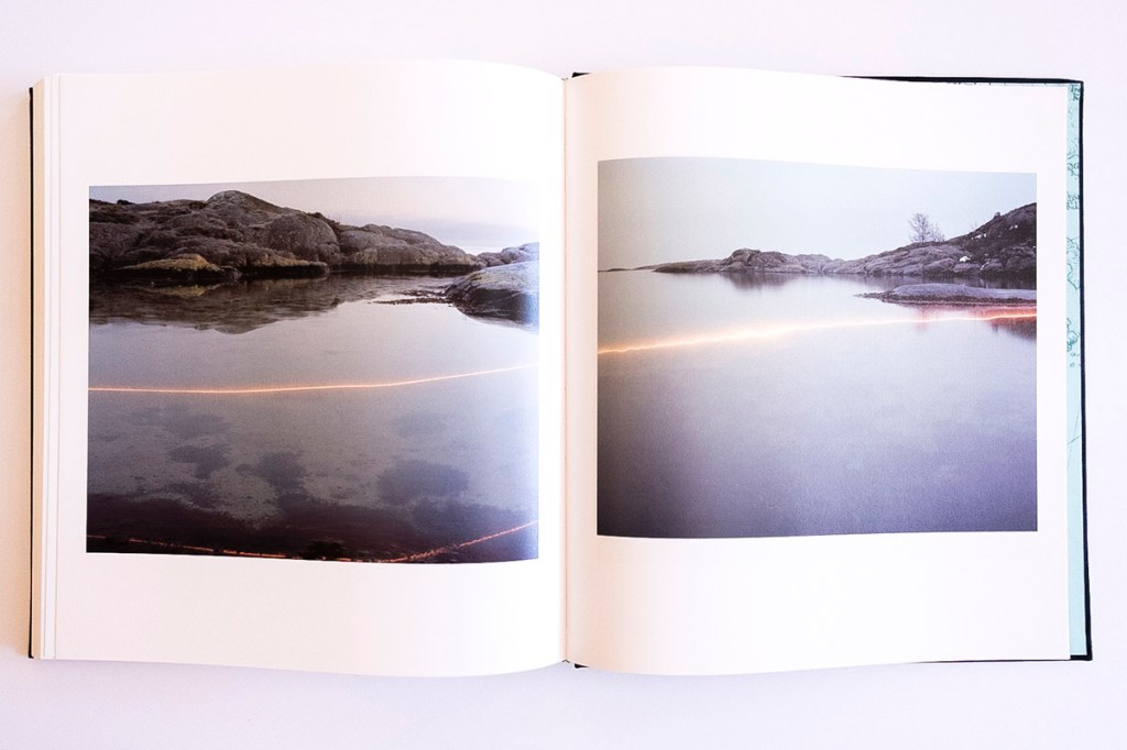 We can start with where in space Brodersen works: Lyngør. Indeed, this is precisely how the reader experiences it – a spot on a map, here displayed on the aquamarine endpapers of this tastefully bound book, completed with a blue canvas cover specked with a few points of glitter that reflect variously in different light that is reminiscent of, perhaps, a few flecks of snow or sea spray hitting a wool sweater in winter. These design choices are no accident, as every aspect of the project has been carefully considered, and furthermore, Brodersen has prepared a number of different special edition books made with sail cloth covers of different sorts.