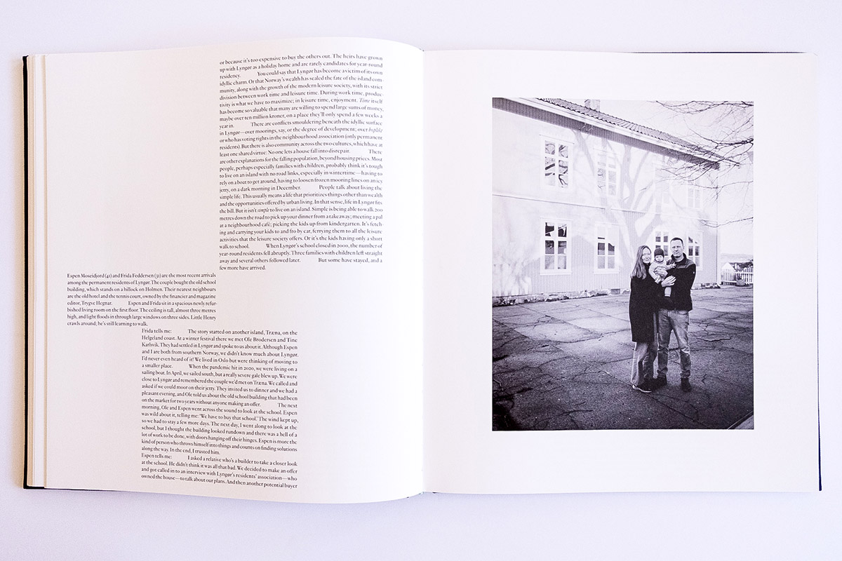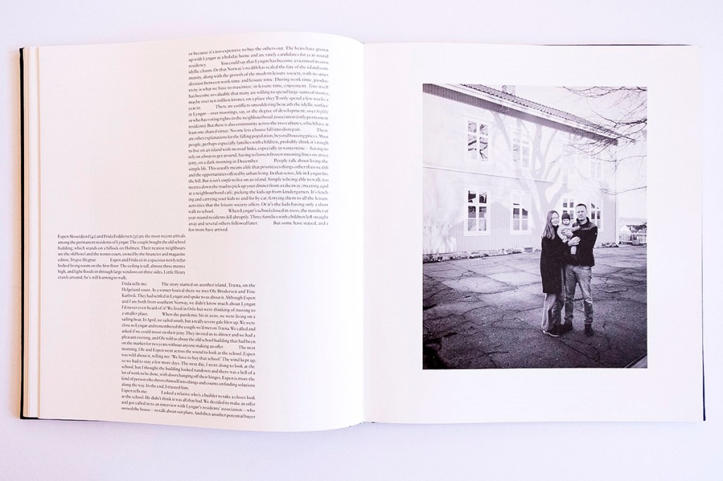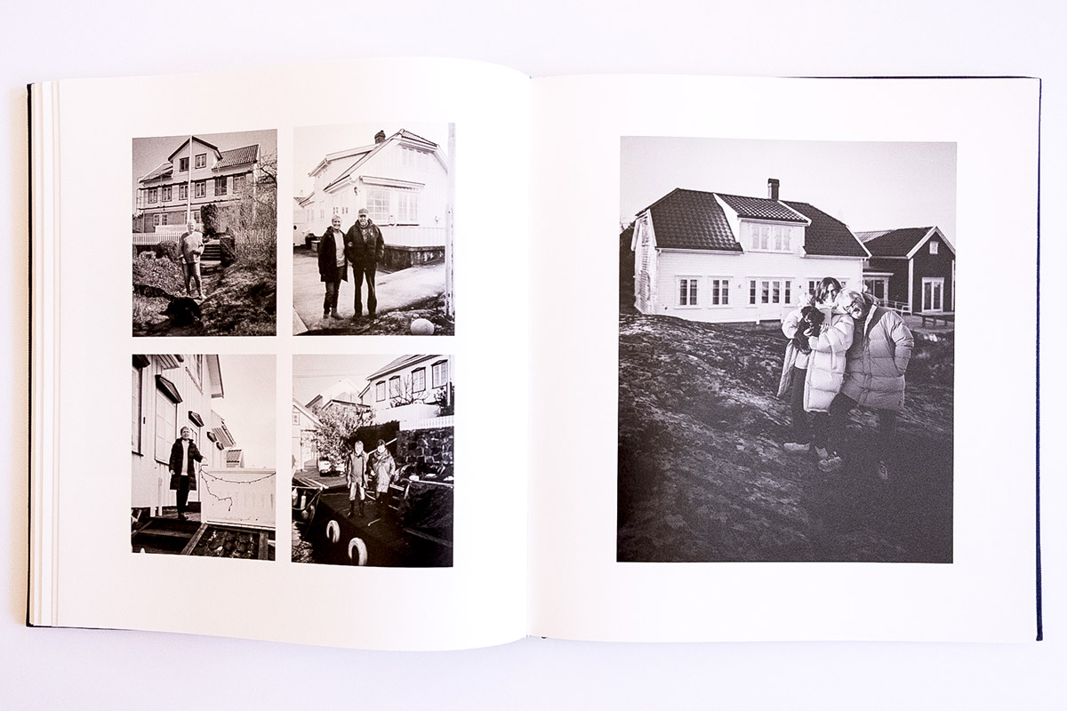 The more journalistic text by Simen Tveitereid develops some of the same themes as Haugland, although it focuses on the contemporary stories and quotidian dimensions of life in Lyngør. The design choices here are logical, as the reader discovers the images paired with the text correspond to the interviews being described with residents, many of whom have spent decades in Lyngør. Still, the tensions Haugland describes are here too. Few have been able to spend their entire lives in Lyngør. Family, work, and other factors pull them away. Yet, the apparently ineffable qualities and community of the place sometimes pull them back. Brodersen’s portraits, made in front his subjects’ and indeed, neighbors’ homes, are environmental portraits whereby he gave them a remote to trigger his view camera. His goal was to reassert the agency of the subjects, and in addition to taking in the scenes as a whole, the images do evoke a certain pensive, but content quality that we often see little of lately amidst the more common contemporary practice of stoic and serious portraiture.