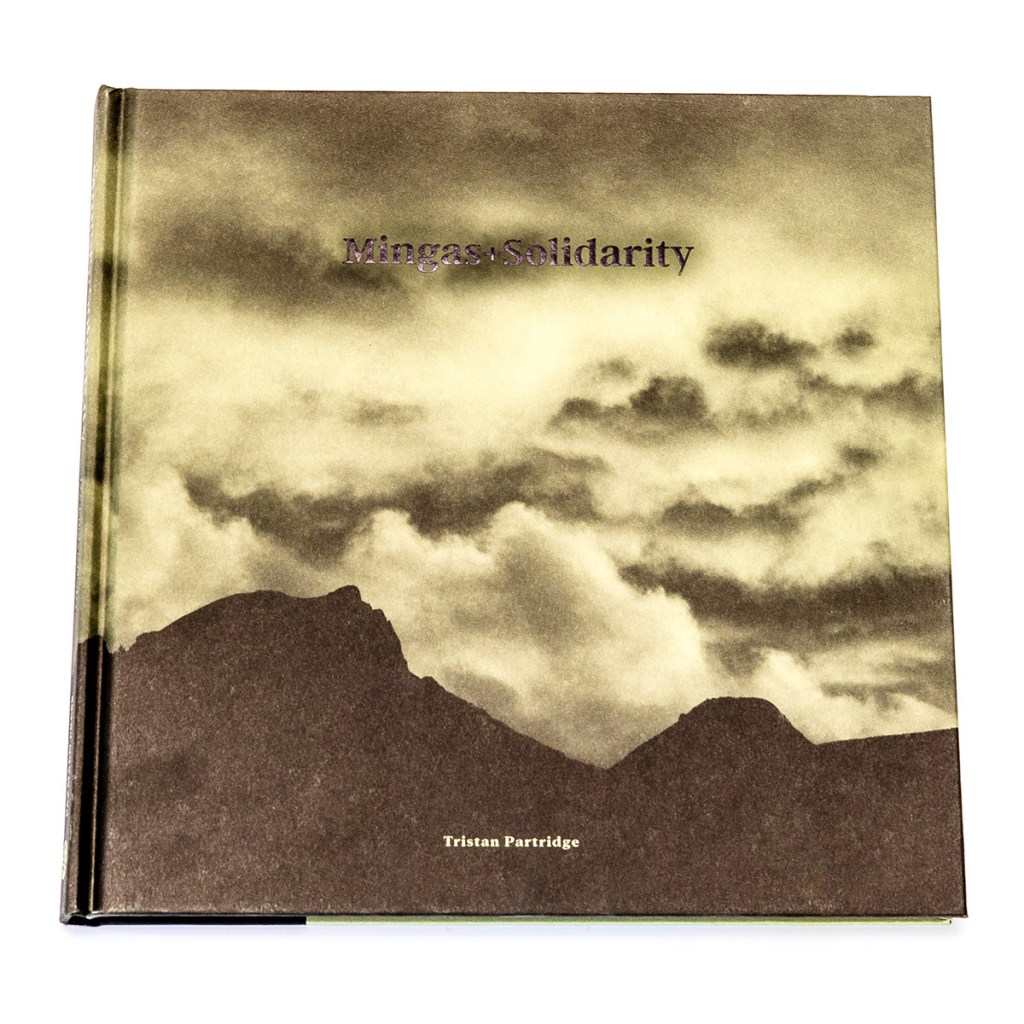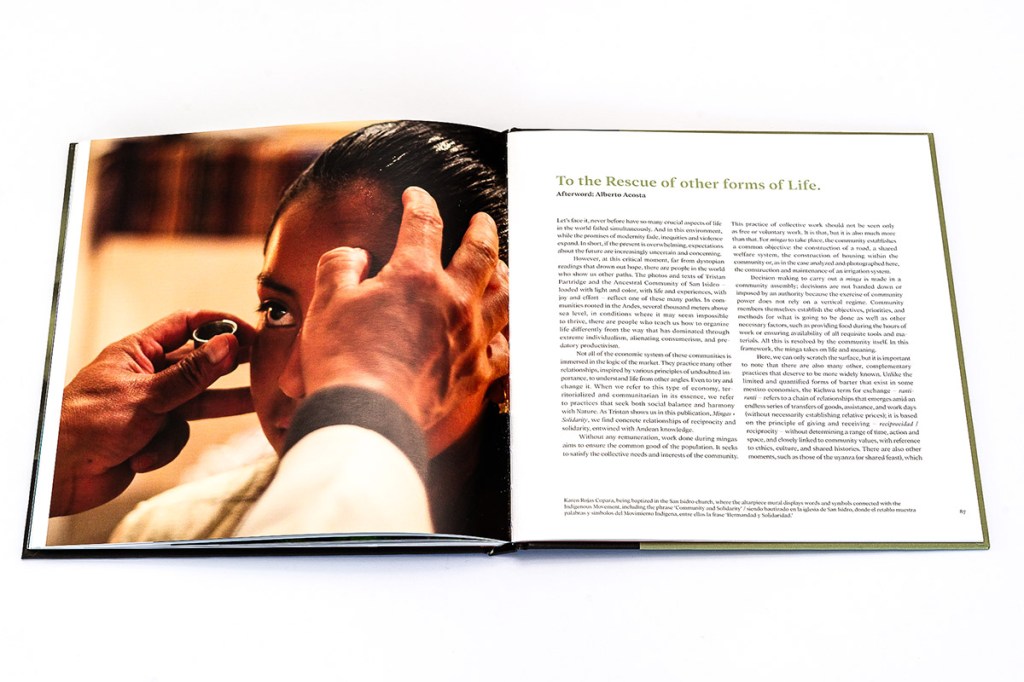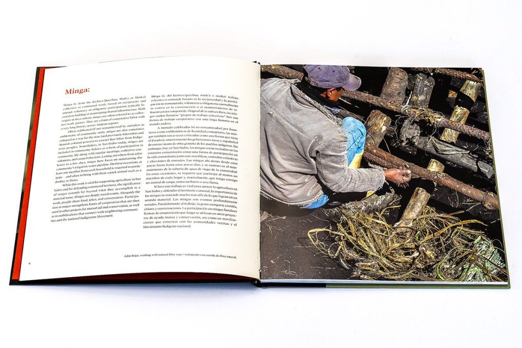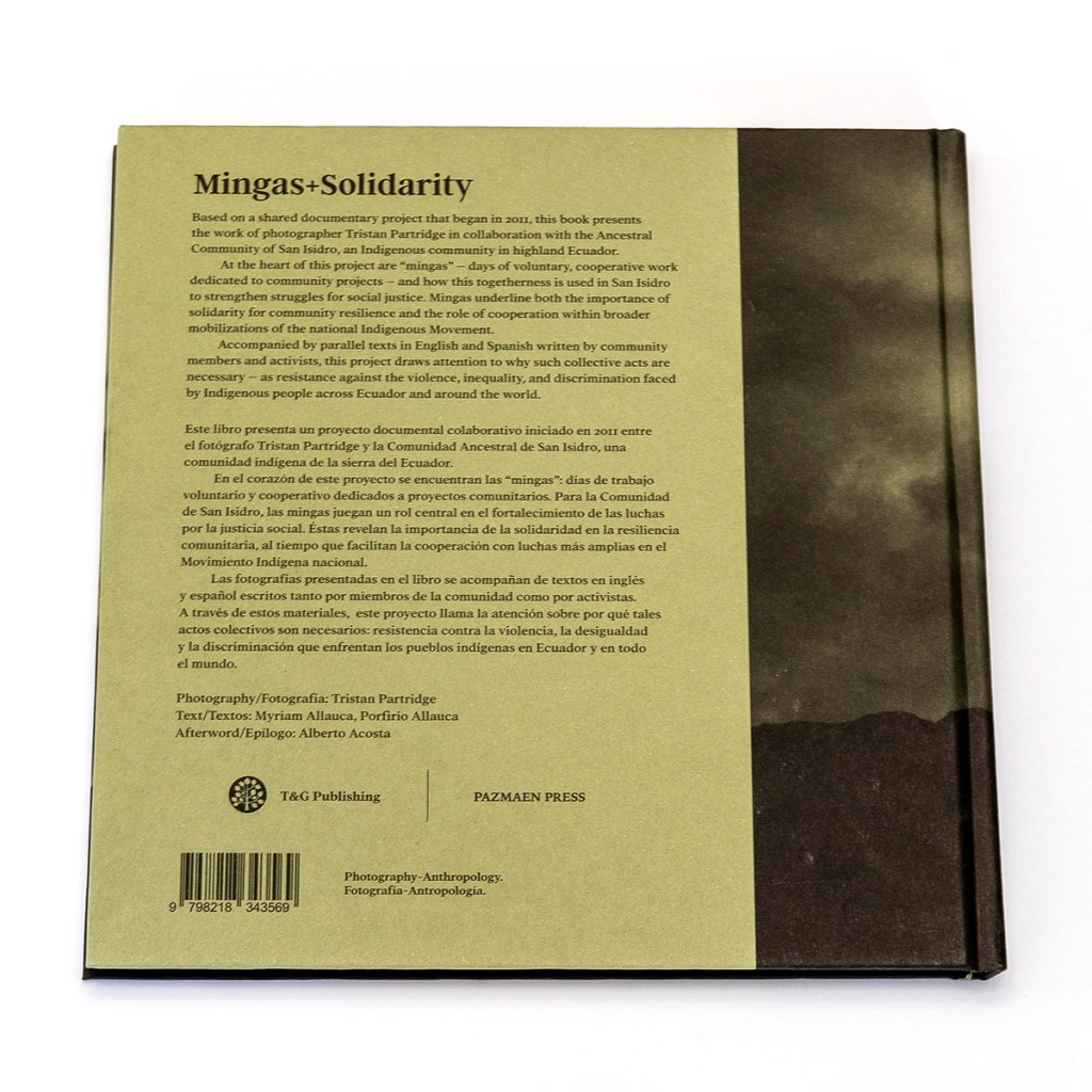 In Mingas+Solidarity, photographer and anthropologist Tristan Partridge introduces us to the cultural tradition of minga in the ancestral community of San Isidro, Cotopaxi, Ecuador. The word “minga” is adapted from the Kichwa/Quechua word Mink’a or Minka, and as we learn from the book’s introduction, indicates “collective or communal work, based on reciprocity and unpaid, voluntary, or obligatory participation; typically focused on building or maintaining shared infrastructure. With origins in Inca culture, mingas are often referred to as collective work parties. They are a form of cooperative labor with a very long history across Andean regions” (p. 6). And it is in a similar spirit of community, collaboration, and shared knowledge production that this photobook seems to have been created. While it is Partridge’s name on the front cover, to communicate the cultural meaning and importance of mingas, the book heavily relies on short written statements from locals who have participated in mingas over the course of their lives, including community residents Porfirio Allauca and Myriam Allauca. With all text appearing in both English and Spanish, it is clear that this book is for a local audience as much as any other.