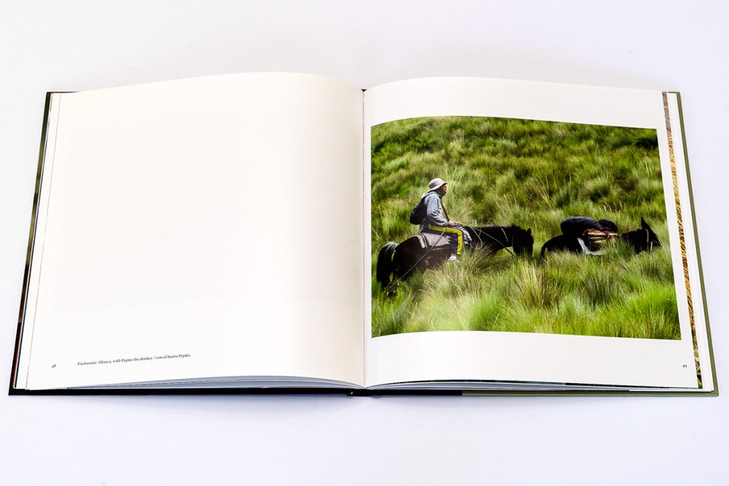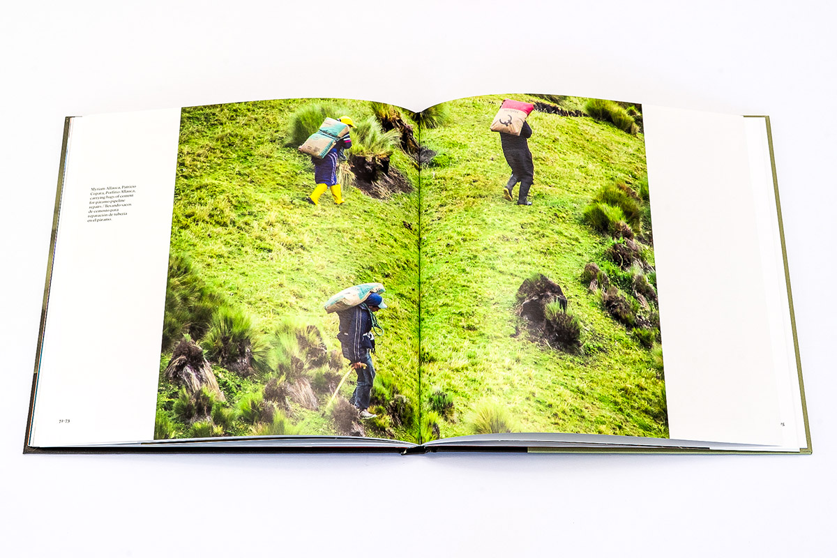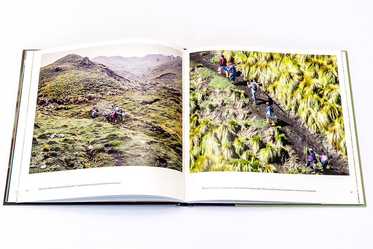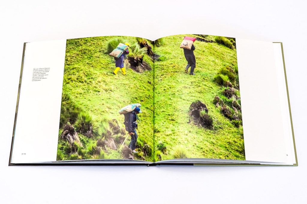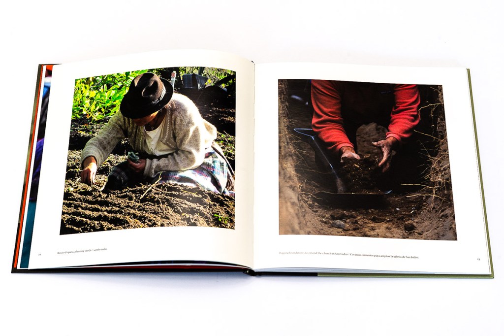 In Mingas+Solidarity, photographer and anthropologist Tristan Partridge introduces us to the cultural tradition of minga in the ancestral community of San Isidro, Cotopaxi, Ecuador. The word “minga” is adapted from the Kichwa/Quechua word Mink’a or Minka, and as we learn from the book’s introduction, indicates “collective or communal work, based on reciprocity and unpaid, voluntary, or obligatory participation; typically focused on building or maintaining shared infrastructure. With origins in Inca culture, mingas are often referred to as collective work parties. They are a form of cooperative labor with a very long history across Andean regions” (p. 6). And it is in a similar spirit of community, collaboration, and shared knowledge production that this photobook seems to have been created. While it is Partridge’s name on the front cover, to communicate the cultural meaning and importance of mingas, the book heavily relies on short written statements from locals who have participated in mingas over the course of their lives, including community residents Porfirio Allauca and Myriam Allauca. With all text appearing in both English and Spanish, it is clear that this book is for a local audience as much as any other.