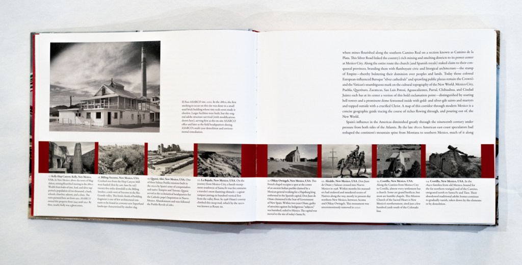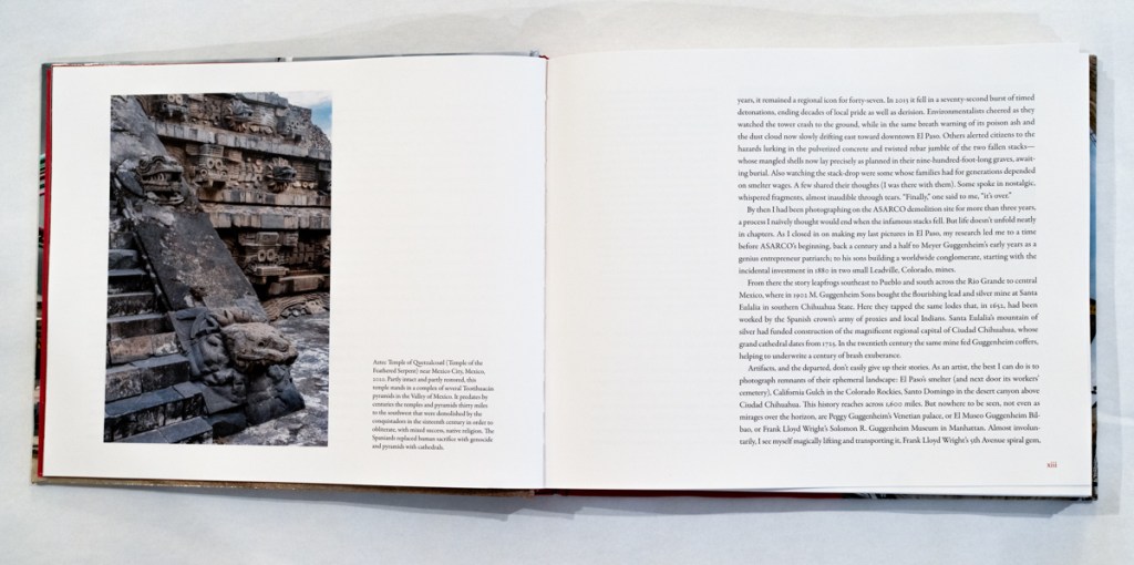 I tried to imagine how Stupich associated Guggenheim’s unstoppable march of industrialization with the conquistadores’ swath of environmental and human violence and exploitation. After reading his story and included essays, studying his images, map, and graphics…it had to be the land. He spent 15 years photographing the land and site of the American Smelting and Refining Company (ASARCO) in El Paso. Most of the images are from just prior to and during the El Paso plant’s demolition. I’m guessing the massive El Paso ASARCO facility spoke to Stupich and had him going down a rabbit hole of how ASARCO grew, where it grew and how El Paso’s site was a metaphor for the company’s view on the people who worked, lived, and died on ASARCO land.