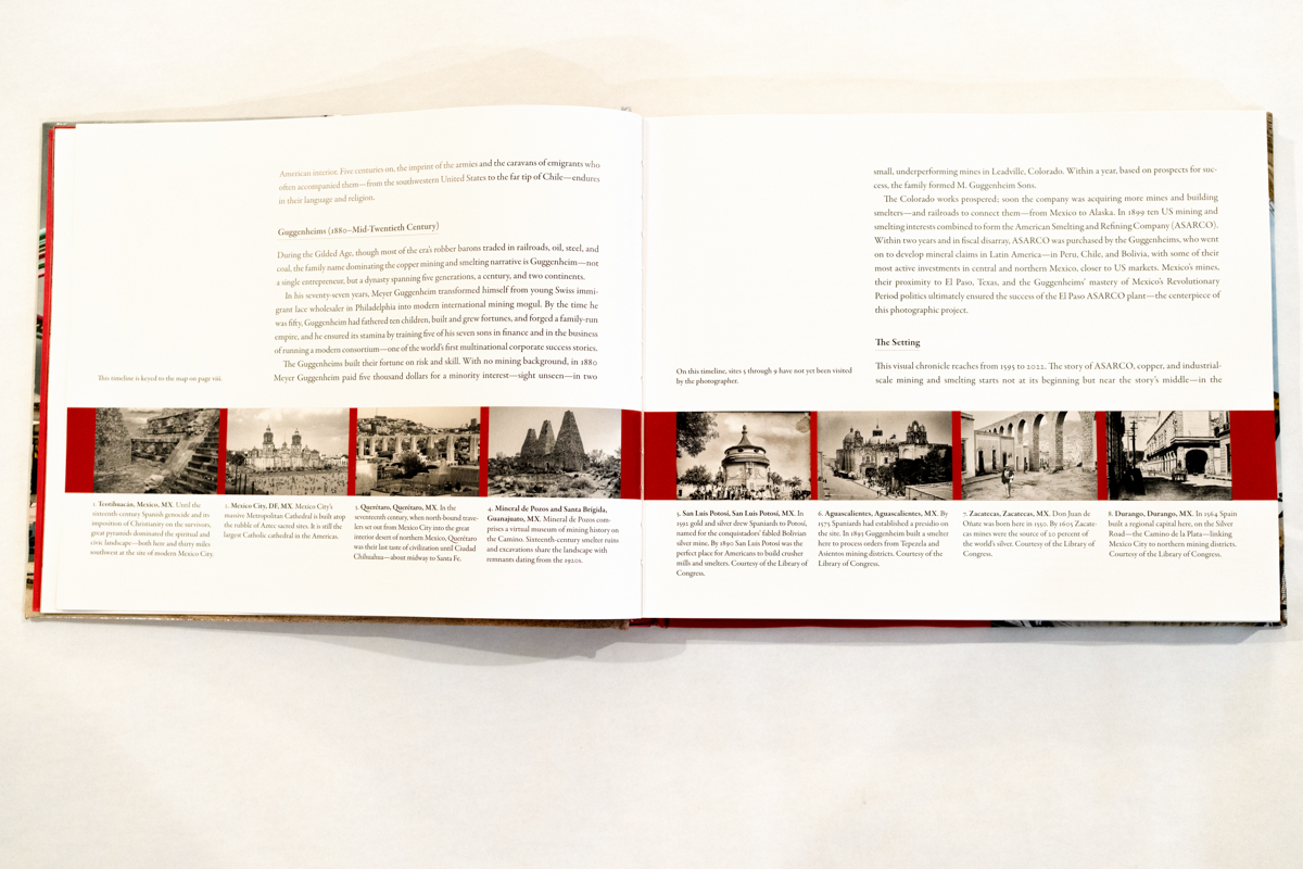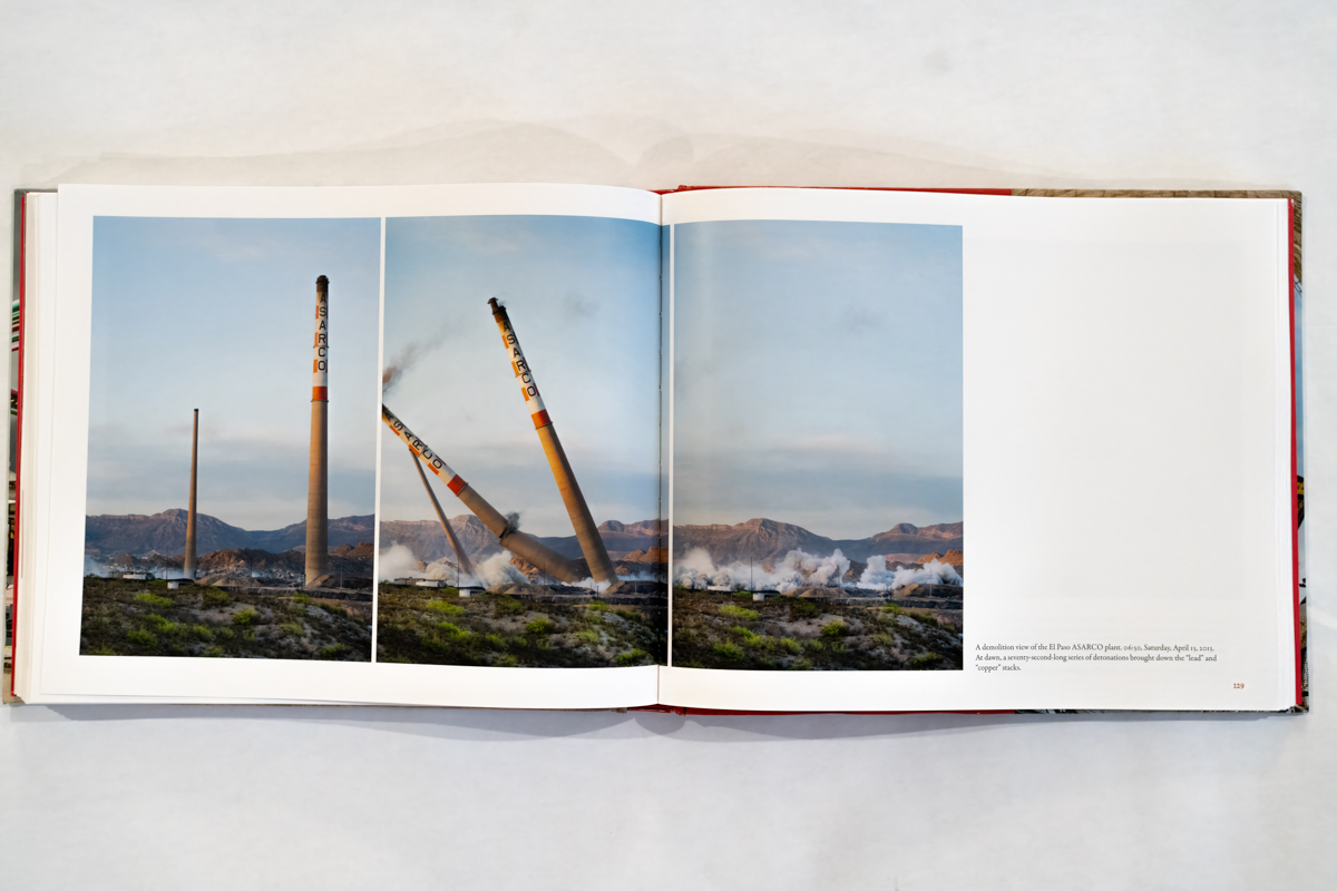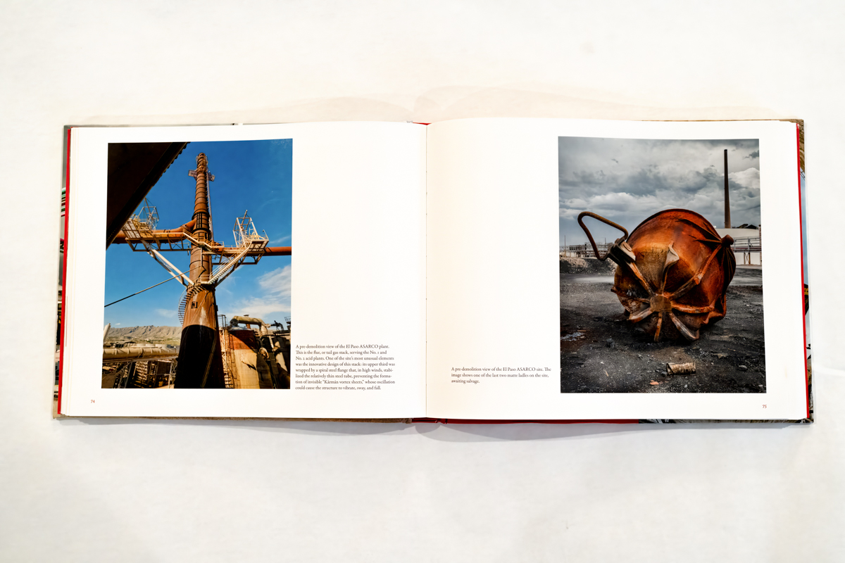 I tried to imagine how Stupich associated Guggenheim’s unstoppable march of industrialization with the conquistadores’ swath of environmental and human violence and exploitation. After reading his story and included essays, studying his images, map, and graphics…it had to be the land. He spent 15 years photographing the land and site of the American Smelting and Refining Company (ASARCO) in El Paso. Most of the images are from just prior to and during the El Paso plant’s demolition. I’m guessing the massive El Paso ASARCO facility spoke to Stupich and had him going down a rabbit hole of how ASARCO grew, where it grew and how El Paso’s site was a metaphor for the company’s view on the people who worked, lived, and died on ASARCO land.