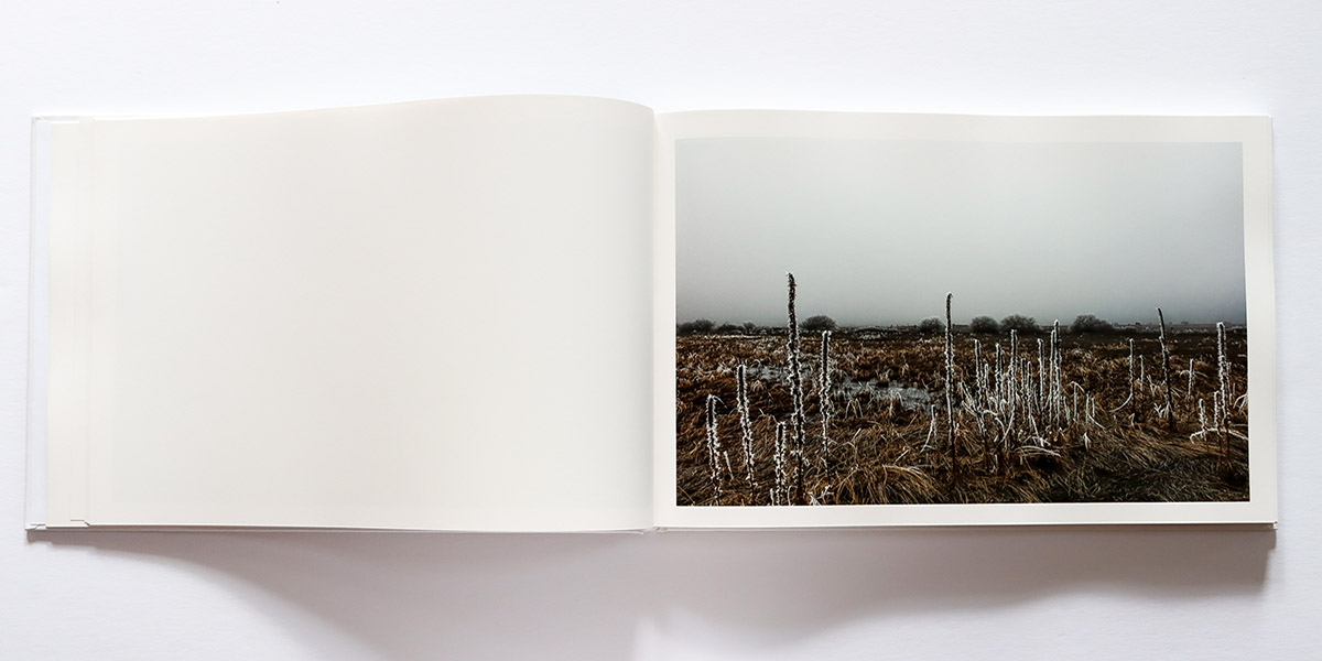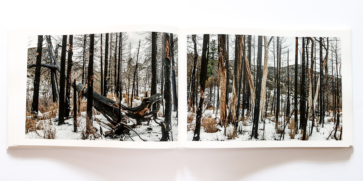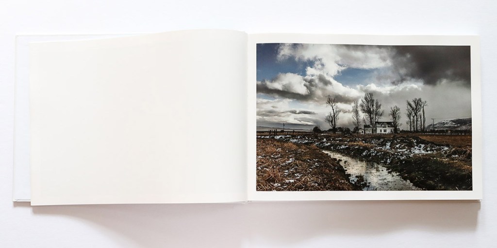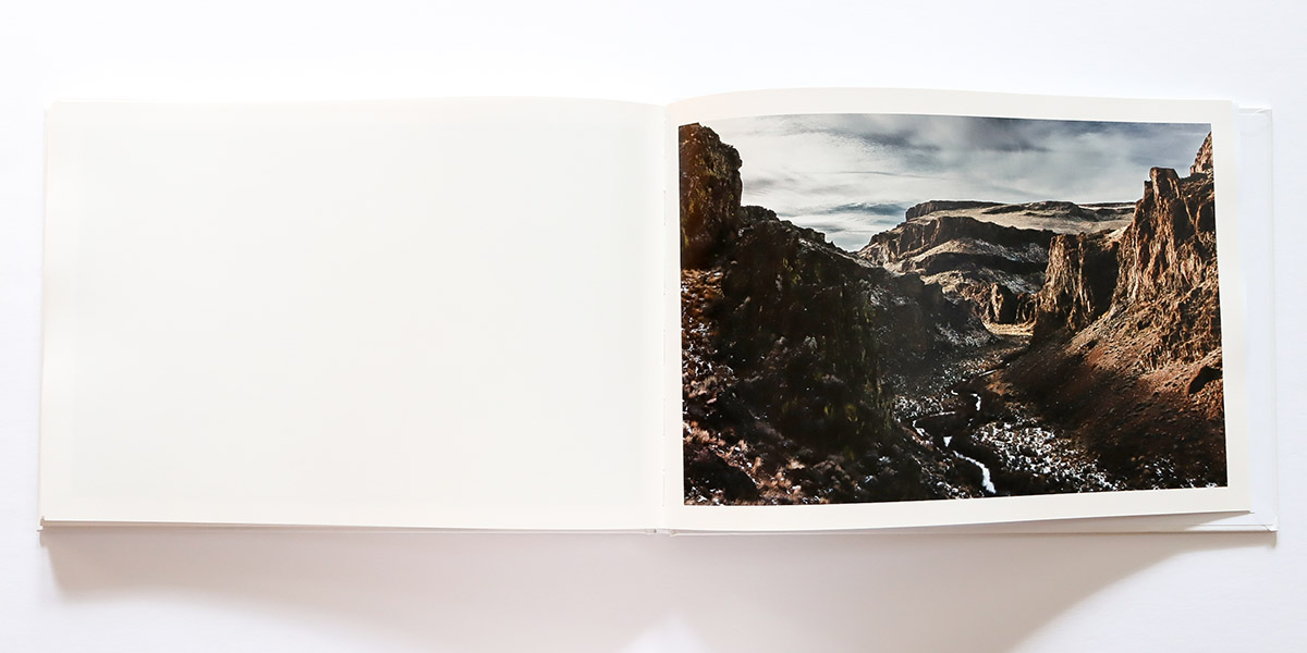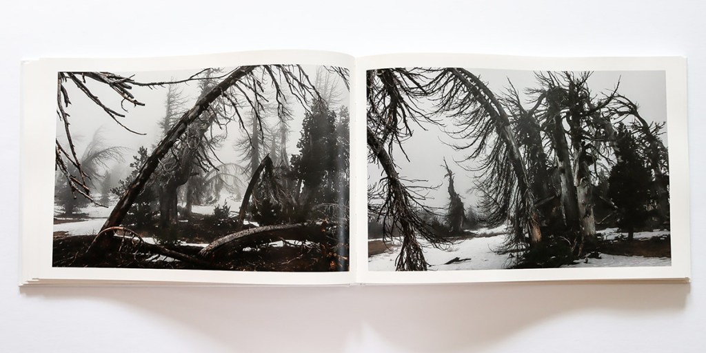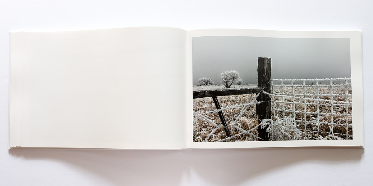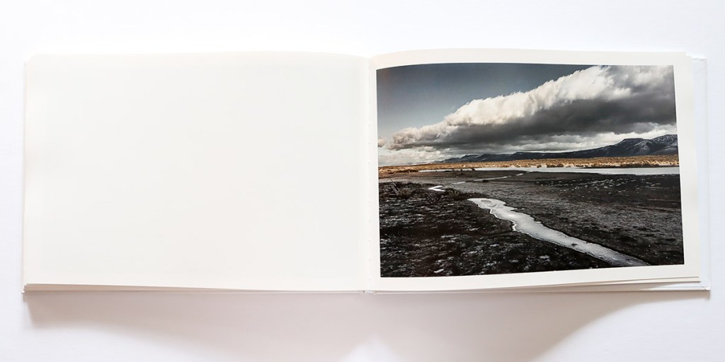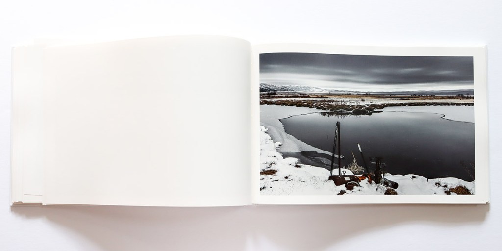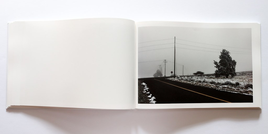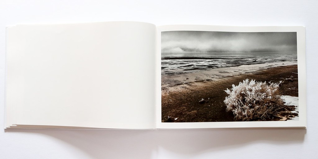 The 81 photographs in Winter are mostly one to a page, on the right side, with five spreads of two photographs that read as contiguous frames, making the total measurement of these combined images about two feet, some 61 centimeters. Immersive, the book mirrors the vastness of the landscape.