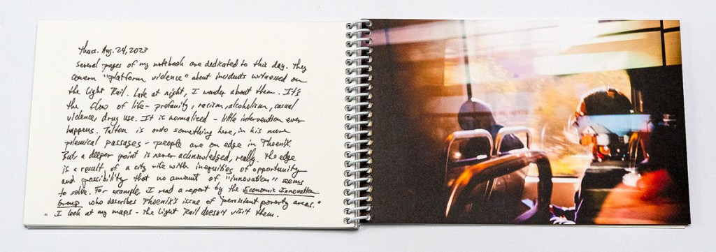 A Desert Transect, which is the latest photobook from sociologist and photographer Brian O’Neill, attempts to unpack everyday life and mobility in Phoenix through a combination of photography and ethnographic observation on the city’s monorail system. As we ourselves are ethnographers and visual sociologists, we couldn’t help but feel excitement as we turned through the pages. Through this project, O’Neill makes two contributions. First, O’Neill offers a glimpse into the process of ethnographic social science. In so doing, he considers the utility and potential of photography and suggests a method by which that potential might be achieved. Second, and more abstractly, after reviewing the book and coming together to discuss it, we found ourselves pondering a large but central question: “What kind of place is a city?”