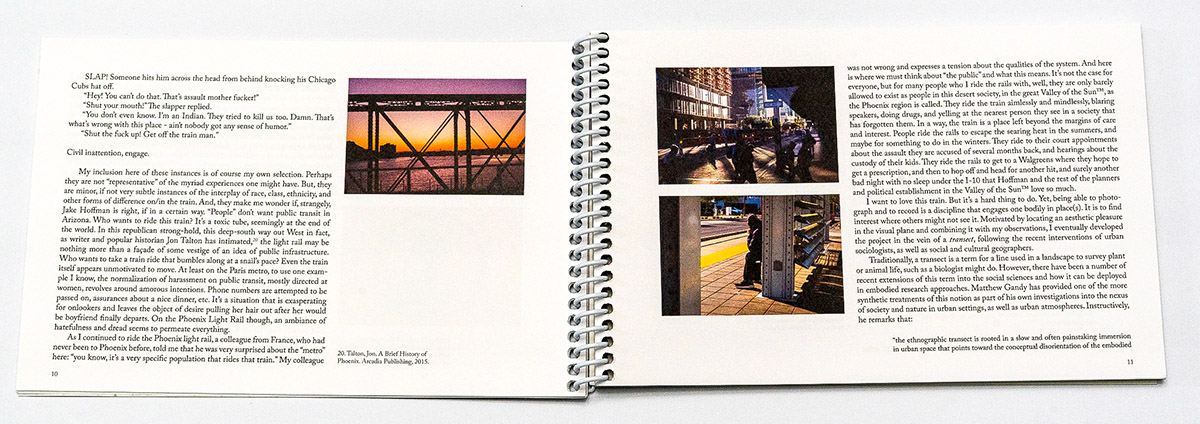 A Desert Transect, which is the latest photobook from sociologist and photographer Brian O’Neill, attempts to unpack everyday life and mobility in Phoenix through a combination of photography and ethnographic observation on the city’s monorail system. As we ourselves are ethnographers and visual sociologists, we couldn’t help but feel excitement as we turned through the pages. Through this project, O’Neill makes two contributions. First, O’Neill offers a glimpse into the process of ethnographic social science. In so doing, he considers the utility and potential of photography and suggests a method by which that potential might be achieved. Second, and more abstractly, after reviewing the book and coming together to discuss it, we found ourselves pondering a large but central question: “What kind of place is a city?”