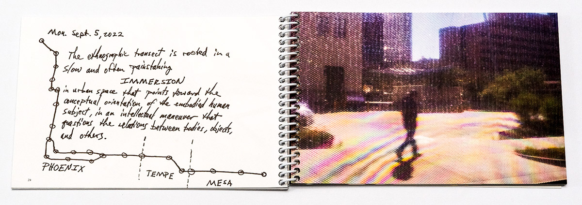 Thus, whether riding or walking, the process becomes about forms of reflection. Importantly, it is about the obstruction/mediation. Perhaps it is this kind of limitation that makes knowledge possible – that enacts a kind of deep inscription, if not a mapping, in the artist/writer/photographer/documentarian. And so, what are we to see and move through in the urban desert – this transect of life in this peculiar civilization? (pp. 12-13)