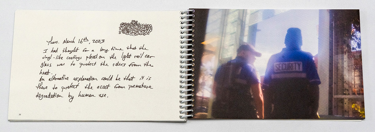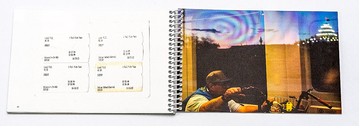 It is through this process that cities, and community life more generally, can be read from various vantage points, including the railcar. But, as O’Neill himself asks, “what’s the deal with photographing (on) trains” (p. 5)? Through an examination of Phoenix’s Light Rail System, O’Neill’s photobook focuses on mobility and public life in sprawling, often lonely, sometimes hostile, urban environments. For him, public transit represents a literal and metaphorical passage through urban social terrains. By observing the light rail, we observe the deeply socio-political dimensions of everyday public life. Using his camera as a tool to document and then contextualize these mobile spaces, he transforms what we would typically view as mundane settings and conditions into a narrative force – a public environment threaded through the Phoenix metro area and shaped by neglect and hostility. In this way, the photos provided are not simply to document. The photographs provide evidence of the social barriers that divide rail riders from other Phoenicians. Through visuals of city landscapes and individuals in transit, O’Neill uses the windows of the light rail to give his audience a glimpse into everyday life filtered, through – perhaps even skewed or obstructed by – heat resistant windows and the desert sun.