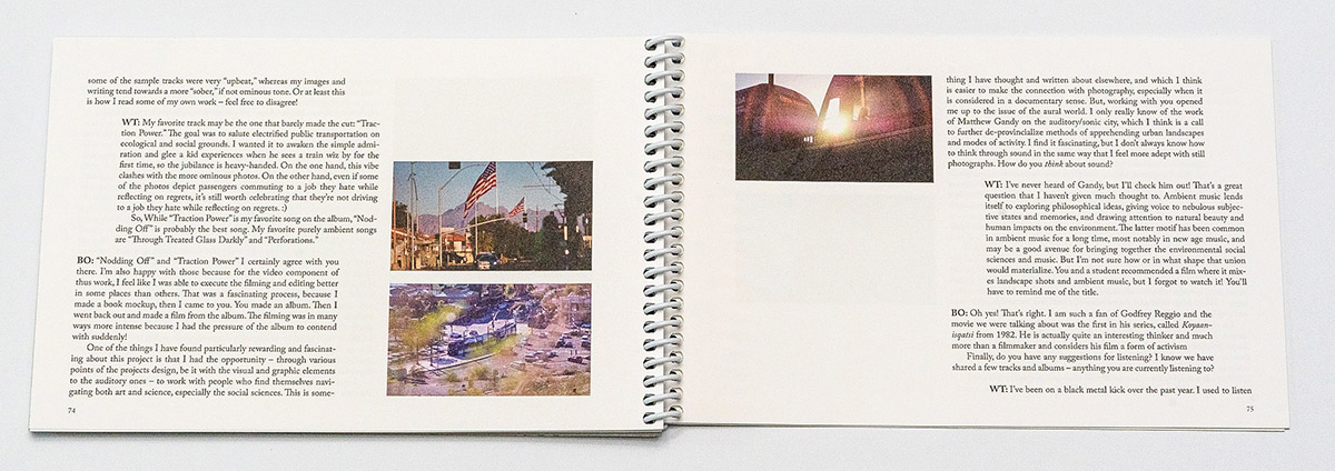 A Desert Transect is a wonderfully thoughtful and meticulously composed work of visual ethnography. Though clever uses of desert and railcar lighting, O’Neill maximizes the film-like, nostalgic quality of images captured by Fuji Film cameras, but more importantly, provides a model for bridging art, documentary, and social science. The intertextual engagement between theory, ethnography, and critical observation, all enclosed within its 8.5” x 5.5” rectangular pages, make for a thought-provoking reading experience. Further, the book presents a satisfying blend of material styles, including, on the one hand, a spiral binding that invokes the field-based nature of the project. On the other hand, the book is printed with high quality materials, including matte archival quality pages that make the reader feel as though they are holding a valuable artifact that would more appropriately belong to a museum or gallery than to personal library.