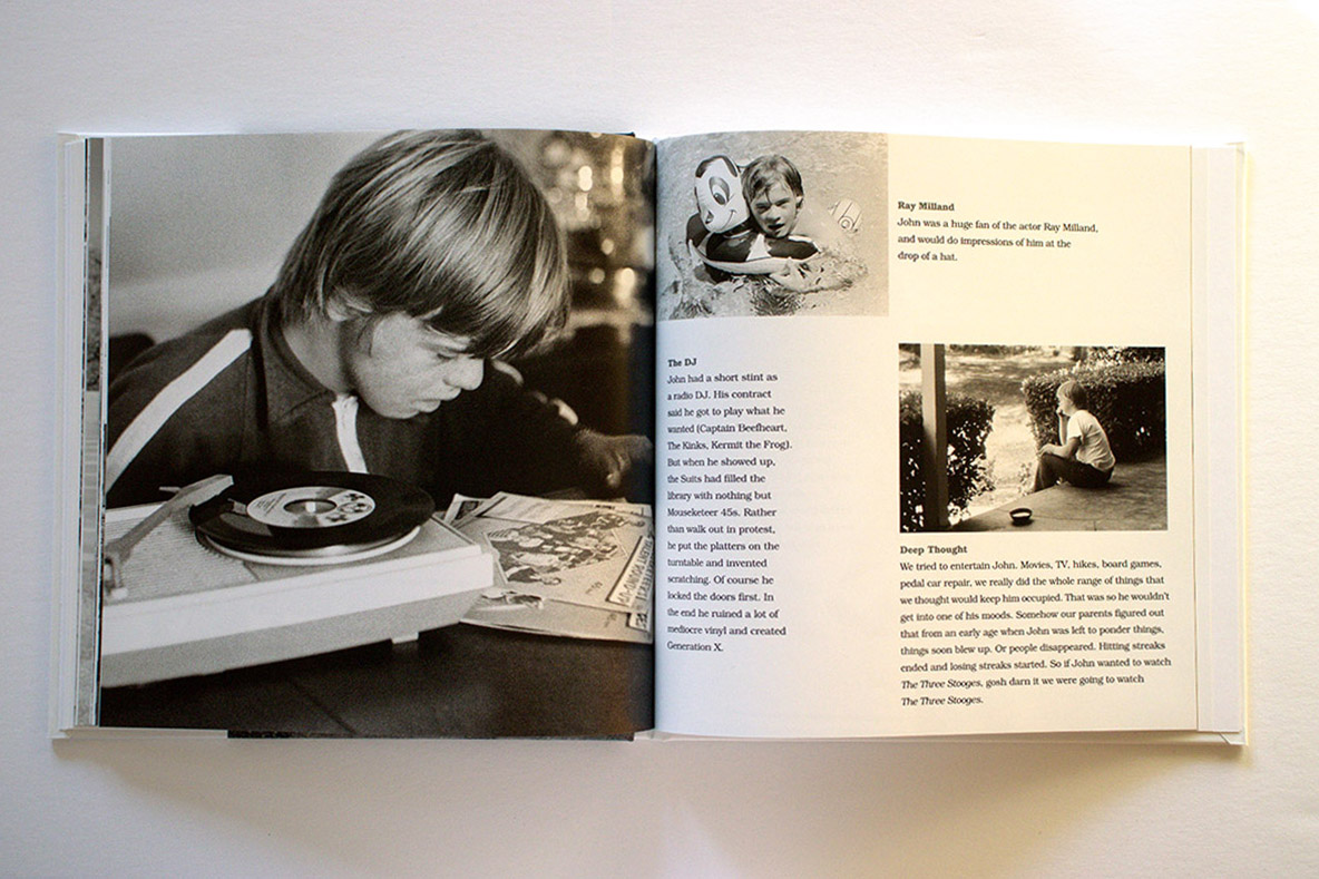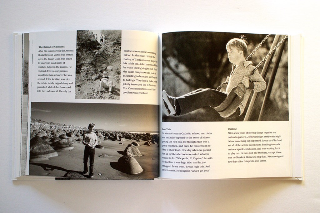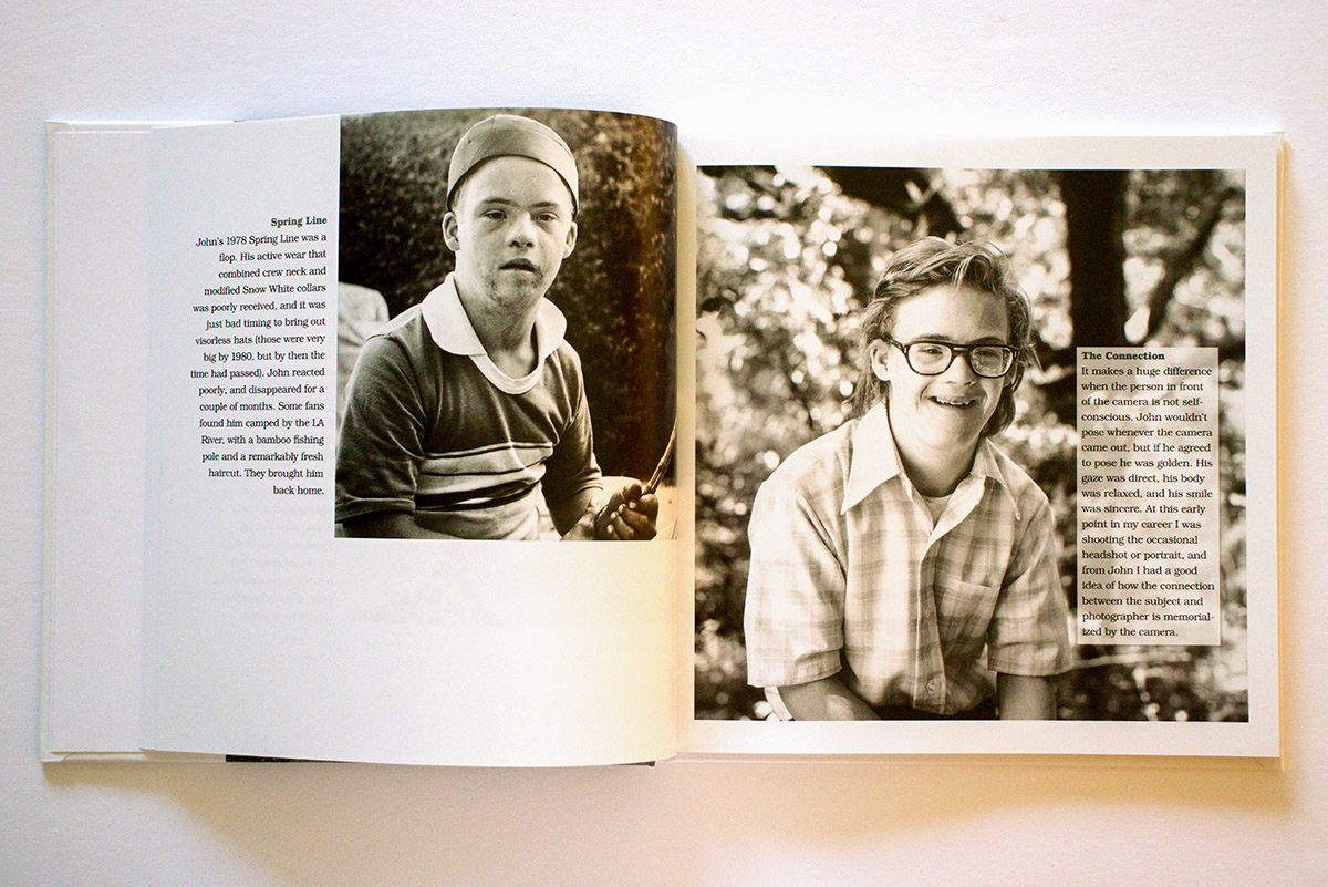 We see John in all of the 66 black and white photographs in the book. We see him mostly from pre-school to high school age in the 1960s and 70s, with a single photo of him as a middle-aged man along with an image of similar vintage on the back cover. The text and photos are by turns serious, heartfelt, humorous, uplifting, touching, lighthearted, and whimsical. Unselfconscious and uninhibited, John, “Johnny,” was an ideal subject for a photographer. We see him fishing, posing for the camera, playing the piano, taking photographs with his older brother’s camera, watching TV, playing with his puppets, hugging his siblings, competing in Special Olympics races, blowing soap bubbles, racing downhill in his “plutonium powered” toy car, exploring the outdoors, riding in his “Moosewagon,” and playing invented games with imaginary characters such as the Balrog of Cachuma.