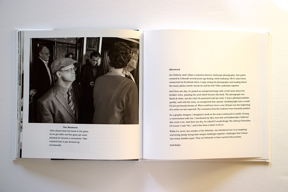 The Johnny Chronicles is a portrait of photographer Joe Doherty’s brother John, the youngest of 8 siblings, who was born with Down syndrome. In 66 photographs and extensive texts, mostly in the form of easy-to-read captions, Doherty tells the story of how John brought and kept his dysfunctional family together, especially after his parents died at a relatively young age. Woven into John’s personal story is the family story as well as background explaining how photographer Joe Doherty got started doing photography.