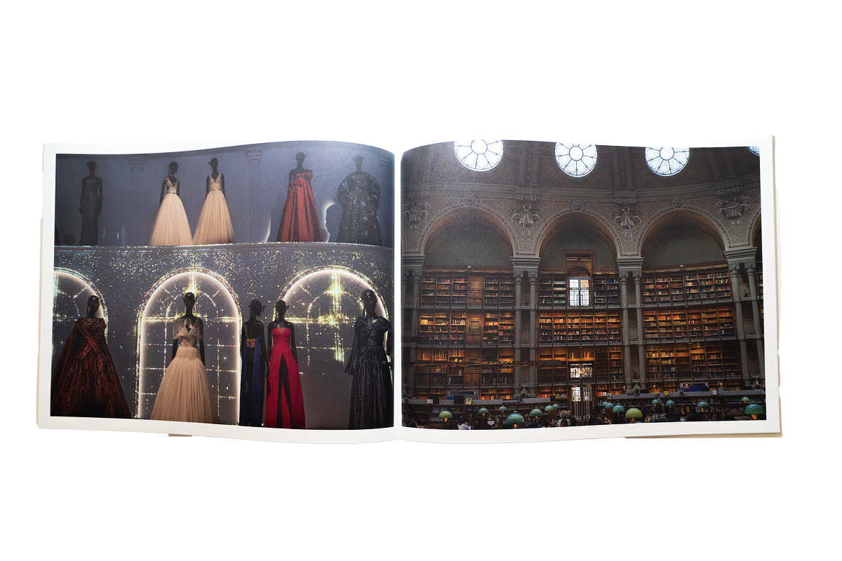 The book has a “mood” of richness, not the financial kind, but the richness of the city’s beauty, its people, its places. We travel from cafes, to museums, to fashion shows, to libraries powerfully sequenced with color and geometry. High fashion mannequins on the left, facing page of a library on the right. How can that work? Tilton brought geometry, perspective and contrast into the mix and the two became a perfect match.