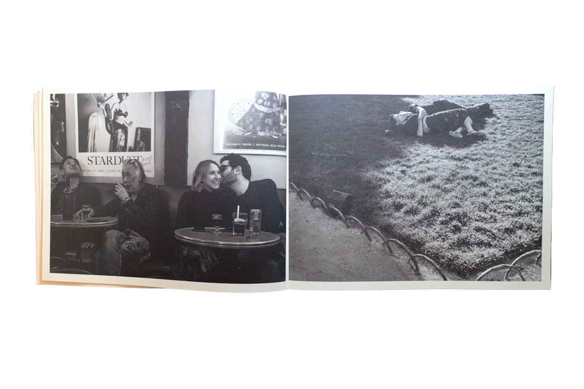 The images are mostly color, but some black and white images appear. For instance, two facing page images of street cafes create a bridge back in time, they could have been taken recently or perhaps 100 years ago suggesting the timeless nature of Paris. The B&W image of a couple nuzzling in a café faces a B&W image of a couple laying in the grass cuddling bringing the “Paris is for Lovers” tradition onto the pages of the book.