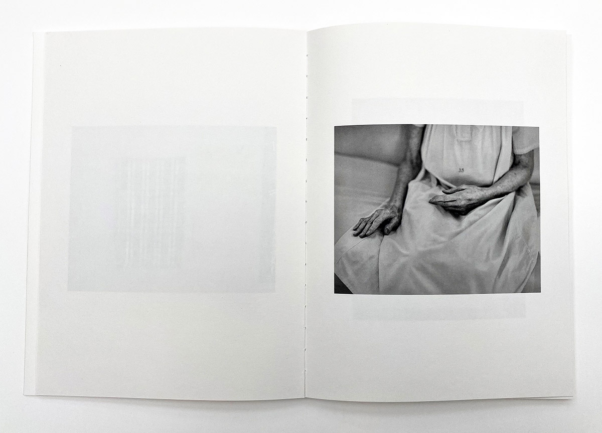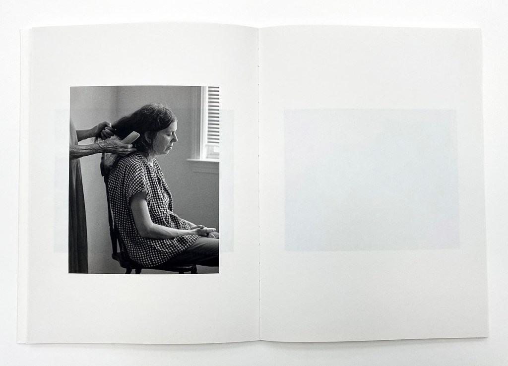 The woman is these photographs is amazing. We do eventually see her face, in the very last photograph of the book. Until then, we only see close-ups of her legs, feet, hands, and arms. Again, these pictures are endless in their simplicity – the woman appears like an aesthetic, garbed only in a drab linen dress, with her body cracked by time, sometimes her legs cropped just like the first photographs of mathematical tools. We also see her combing Ruth’s hair, sharing intimacy and affection in pictures that are remarkably soothing. In a short statement at the end of the book, we do learn a bit more about this woman and why Manenti chose to photograph her: “In the spring of 2017, I was with my mother in an empty room. The light of the sun was shining through the windows. Her best friend June was at her bedside reading poetry aloud. My mother died a few hours later.” This provides essential information for understanding 4 Sides of the Table; the woman in Manenti’s pictures is June, but photographed to recreate a connection with her mother, to help embody the emptiness, love, and grief at the heart of 4 Sides of the Table; such a lovely thing, to express in photographs crafted with deep sensitivity. The repetition provides witness of an evolving relationship, fully realized in the accumulating fragments.