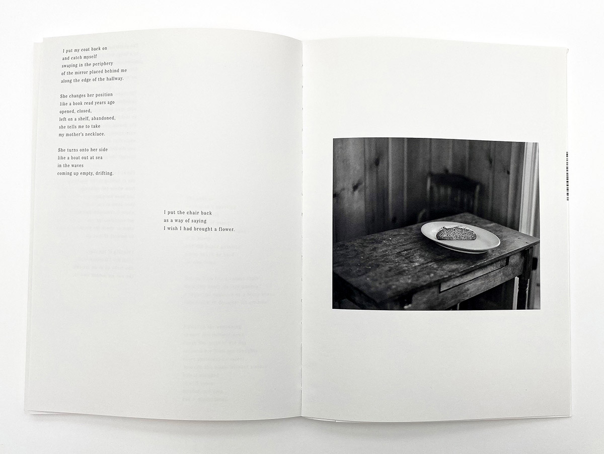 4 Sides of the Table also includes two poems by Manenti, “226 Harrogate Road” and “Pearls”. Unfortunately, they are easily overlooked, but by no fault of their own; the photographs are too captivating. There are some lovely moments in the poetry, too: “She asks me/to remove a painting/from the wall./It’s made of paper/and though it looks light/it is heavy/and the paper painting/turns out to be hard/to take down.” These speak well with the photographs, similarly creating a feeling of boundless emptiness filled with beauty and grief. The poems are worth the time (I’d love to read more) but also don’t feel like they bring too much to the book; the pictures are amazing and don’t need the support, and the design strategy used for displaying the text asks too much of the words, a large font and a rejection of negative space (I wish the design left more white space around the poems, embracing the quiet found in the photographs).